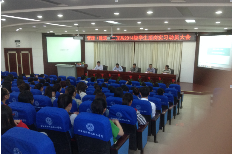 为进一步做好管理(建筑)工程系2014级学生顶岗实习工作,让学生进一步明确顶岗实习的重要意义,引导学生做好顶岗实习准备,5月11日下午4点,管理(建筑)工程系在图书馆报告厅召开2014级学生顶岗实习动员大会,管建系主任张显国,党总支书记杜先扬,系副主任刘圣春,主任助理王红林,14级各班班主任出席了此次大会。会议由党总支副书记杨力主持。