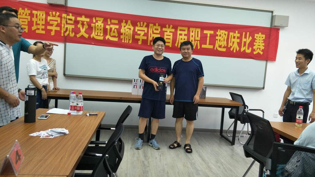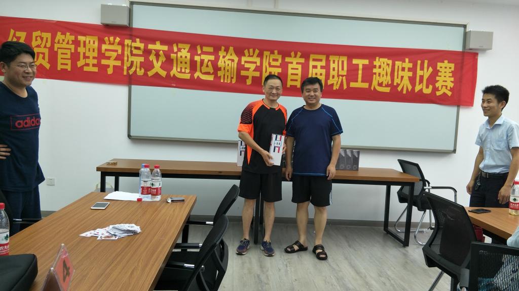 经贸管理学院院长杨力和交通运输学院领导李建新为“掼蛋王”杜先扬、刘峰颁奖