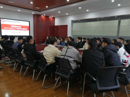 2018年12月28日下午,经贸管理学院在实训室401和403举办了本学期学生座谈会,旨在听取学生对课堂管理、学风建设等方面的意见和建议,提高学院管理水平和教学质量。本次座谈会分别由经贸管理学院副书记刘峰和副院长杨学分主持。经贸学院全体教师、校企共建专业负责人和学生代表参加了此次座谈会。
