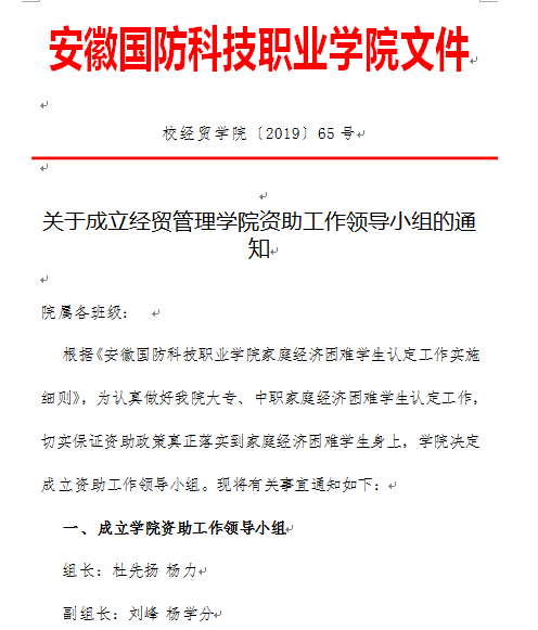 加强工作领导,强化组织保障。9月初,学院召开了党政联席会议,结合《关于开展2019/2020学年家庭经济困难学生认定工作的通知》(校学函〔2019〕31号)文件要求,成立了以党总支书记杜先扬及院长杨力为组长的院资助工作领导小组,并成立了各年级资助工作小组。