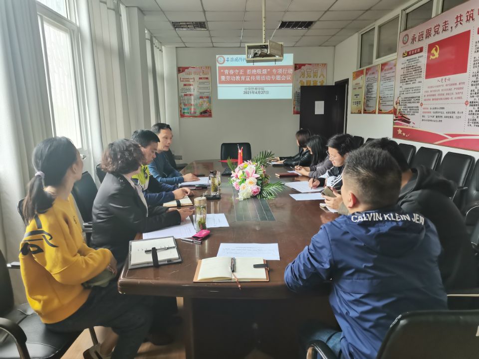 为进一步加强学校大学生思想政治教育工作,促进学生全面发展,提高学校人才培养质量。根据学校工作部署,4月27日下午,经贸管理学院召开了“青春守正 拒绝吸烟”专项行动暨劳动教育宣传周专题会议,党总支书记杜先扬及全体辅导员、班主任参加,会议由副书记刘峰主持。