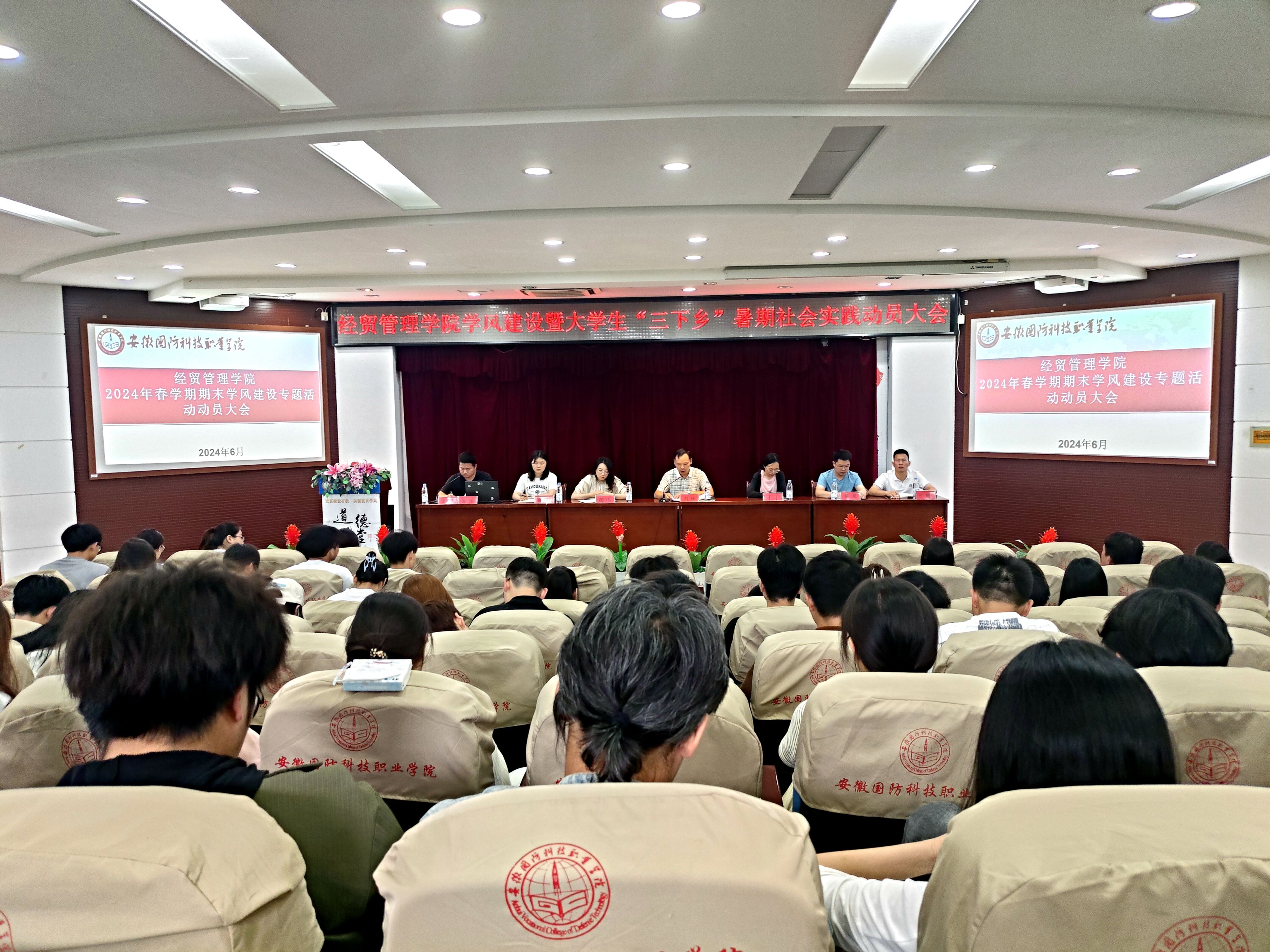 刘峰指出,加强学风建设是提高人才培养质量的迫切需要,是促进学生全面发展的必然要求,全体学生要深刻领会深入加强学风建设的重要意义。他要求,学风建设要全员参与,要自觉树立“我是经贸人,营造优良学风从我做起”的意识,以主人翁的姿态积极参与学风建设各项活动,严格遵守学校各项规章制度,严肃考风考纪,共同努力营造良好的育人环境,不断开创经管学院学风建设新局面。他强调,暑期社会实践是提高大学生综合素质与能力的重要载体,是高校培养人才的有效途径。同学们要在做好自身安全工作的基础上胸怀理想、志存高远,敢于实践、勇于担当,开拓进取、锐意创新,要让做到“下马观花”而不是“走马观花”,始终继承和发扬学校“四特”军工精神,在社会实践中锻炼本领,增强责任意识,让青春绽放绚丽之花。
