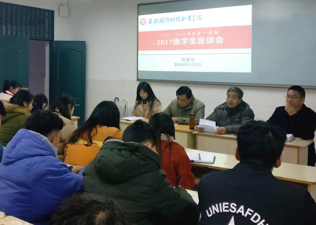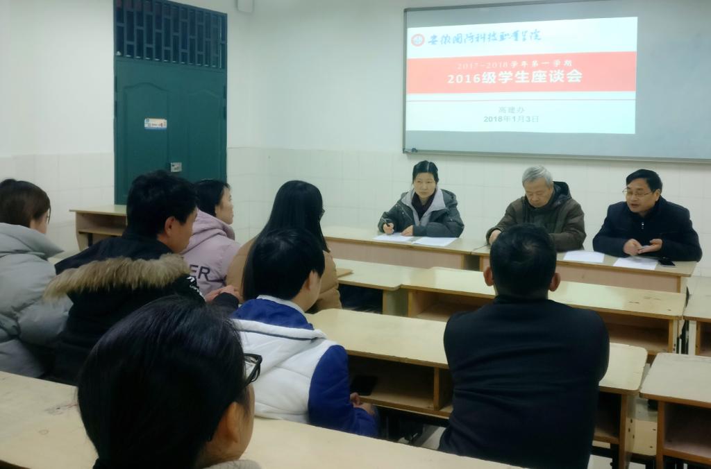 2018年1月3日下午,我校召开了2017-2018学年第一学期学生座谈会。会议分2016级和2017级两个会场举行,分别在beat3652号教学楼408教室和410教室举行。出席会议的有学院督导员夏世林、袁志安、吴方庭、赵守林,高建办主任朱修传、高建办老师叶高洁、刘星怡,以及来自各学院2016级、2017级各班的60多名学生代表。