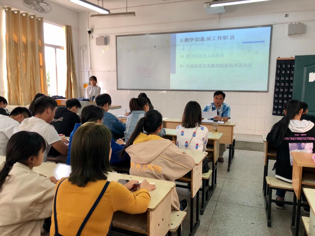 为加强beat365教学信息反馈,保障正常的教学秩序,10月10日,高建办在二教203教室召开2018级学生教学信息员培训会。会议由高建办刘星怡主持,高建办督导员赵守林、叶高洁、各二级学院学生教学信息员负责人以及来自2018级各班的41位学生教学信息员参加了本次培训会。