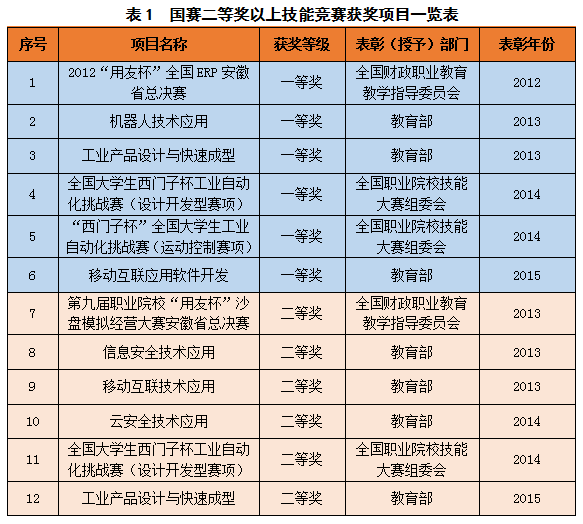 “十二五”期间,学院在省级以上职业技能大赛获三等奖以上奖项186项,其中国赛(A类)一等奖6个,二等奖6个,三等奖17个;省赛(B类)一等奖25个、二等奖60个、三等奖72个,成绩稳居全省前列。多个奖项为全省高校唯一或首次,为安徽省高职院校扬名全国职教赛场增光添彩。在2015年全省高职院校职业技能大赛中,我院总积分位居安徽省高职院校第六名。