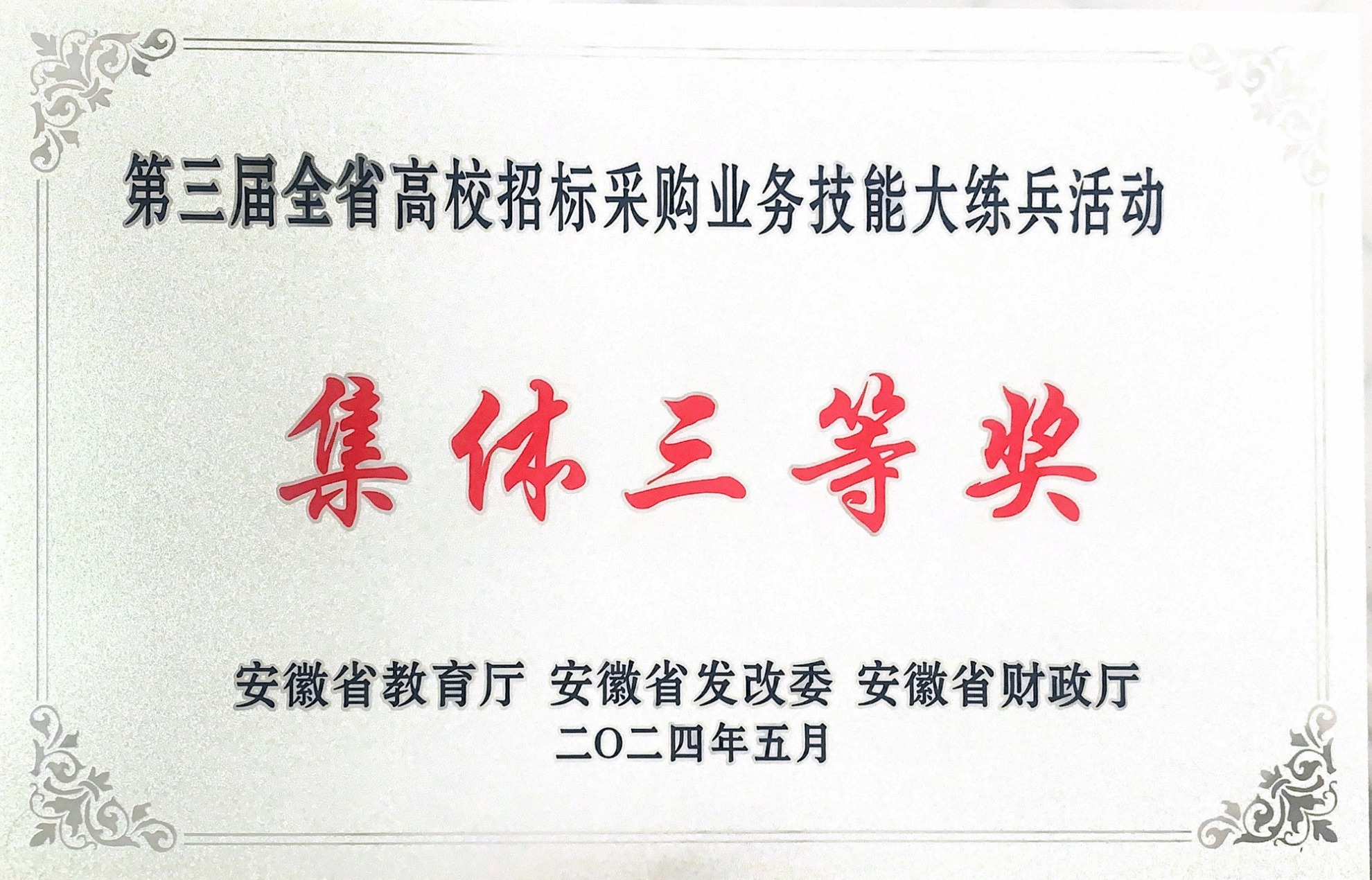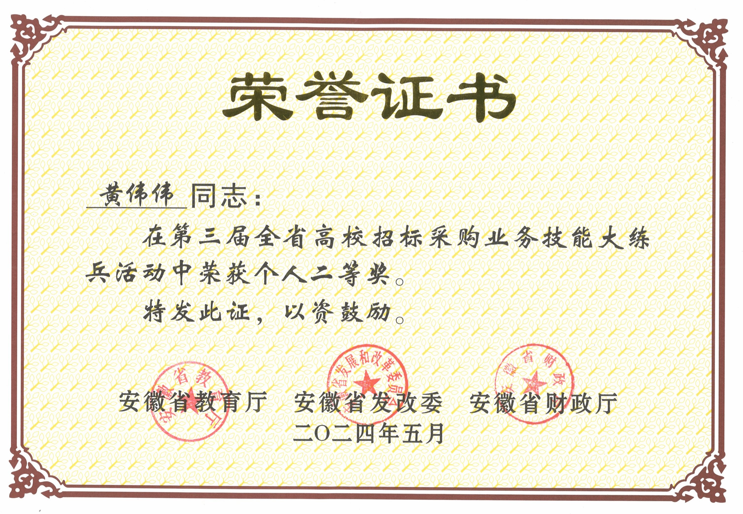 5月15日,由省教育厅、省发展改革委、省财政厅主办,安徽省招标采购协会承办,合肥工业大学、安徽艺术学院、安徽安天利信工程管理股份有限公司协办的第三届全省高校招标采购业务技能大练兵活动决赛在合肥圆满落幕,经过激烈角逐,由匡勇、黄伟伟同志组成的beat365采购代表队发挥出色,荣获高职高专组团体三等奖,黄伟伟同志获个人二等奖。
