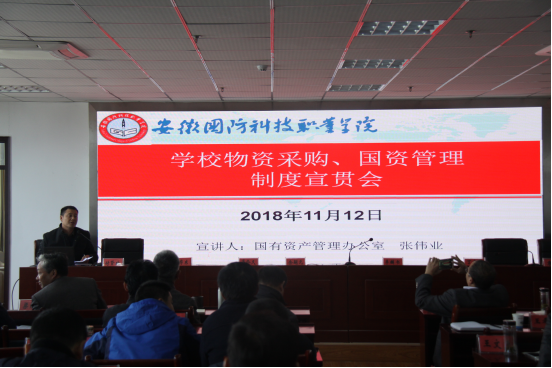 11月12日上午,国资办在学校12楼第一会议室召开物资采购、国资管理制度宣贯会。全体中层干部参会,会议由国资办主任张伟业主讲。
