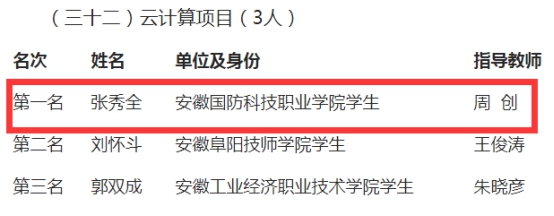 本网讯(信息技术学院 周创)2019年10月28号-29号,在阜阳技师学院举行第46届世界技能大赛云计算项目安徽省选拔赛,beat365学子张秀全同学在周创老师精心指导下,经过2天激烈竞争,凭借扎实的专业技能和出色的现场应变能力,最终取得全省第一的优异成绩,直接入围第46届世界技能大赛安徽省集训队。