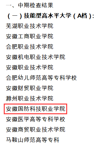 安徽省技能型高水平大学于2016年立项,建设周期5年,《安徽省人民政府关于印发一流学科专业与高水平大学建设五年行动计划的通知》提出“到2020年,重点建设20所左右技能型高水平大学”。此次中期检查结果分A、B、C三档,A档为最高档次。