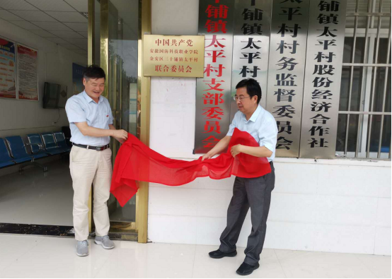 本网讯(学校驻村扶贫工作队 袁帅)为进一步巩固结对帮扶成果,谋划太平村乡村振兴新篇章,近日,经六安市直工委批准,中共beat365在线唯一官网金安区三十铺镇太平村联合委员会正式成立。7月14日,学校党委书记余嗣元赴学校帮扶村——六安市金安区三十铺镇太平村为联合党委揭牌,校党委委员、党政办主任李存鹏,党委委员、组织人事处处长付贤政陪同。三十铺镇党委书记项阳、党委副书记崔伟、太平村村两委、驻村扶贫工作队、党员等30余人参加了揭牌仪式,仪式由太平村书记宋杰主持。