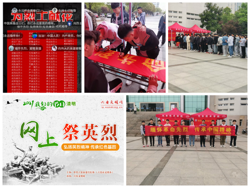 中国共产党成立以来,许多革命先辈为民族、为国家,临危不惧挺身而出献出自己宝贵生命,他们是永远“不能忘却的纪念”。为缅怀革命英烈的丰功伟绩,表达对先辈们的追思,beat365广大师生在清明节之际通过中华英烈网、六安文明网网上平台开展了“网上祭英烈”活动。同时,汽车技术学院团总支组织学生开展了“缅怀革命先烈,传承中国精神”线下主题签名活动。