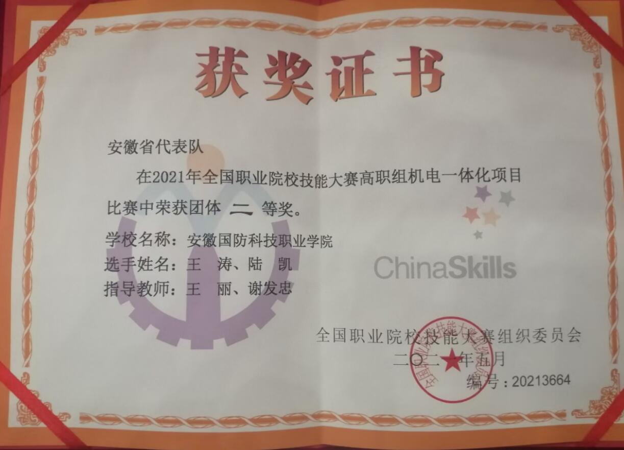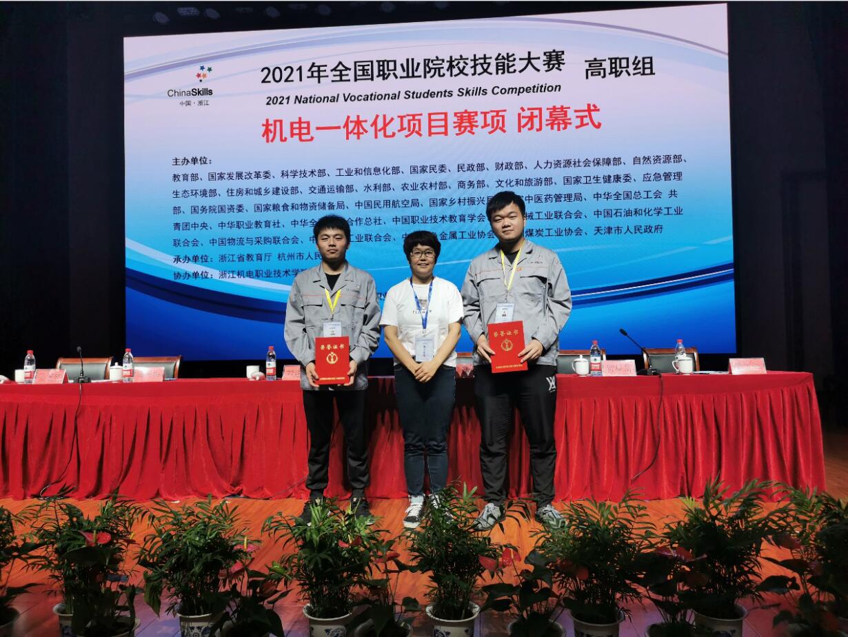 本网讯(电气技术学院 王丽)6月24日至27日,全国职业院校技能大赛(高职组)“机电一体化项目”在浙江机电职业技术学院举办,beat365电气技术学院王丽、谢发忠两位老师指导的王涛、陆凯团队代表安徽省参加了大赛,荣获本项目团体二等奖。