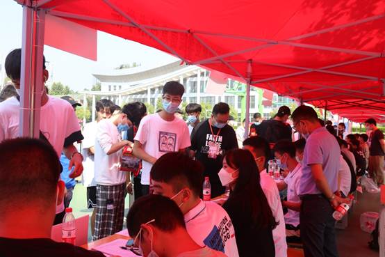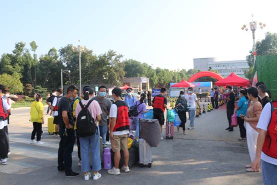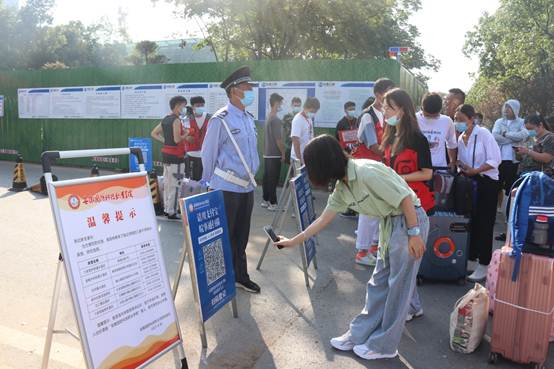 新生同学在现场标示指引下通过入校通道,依次接受返校码、安康码、行程卡和核酸检测报告核验等流程后,有序进入校园,在各院系迎新报到点办理报到手续,领取防疫爱心包和入学资料等物品。
