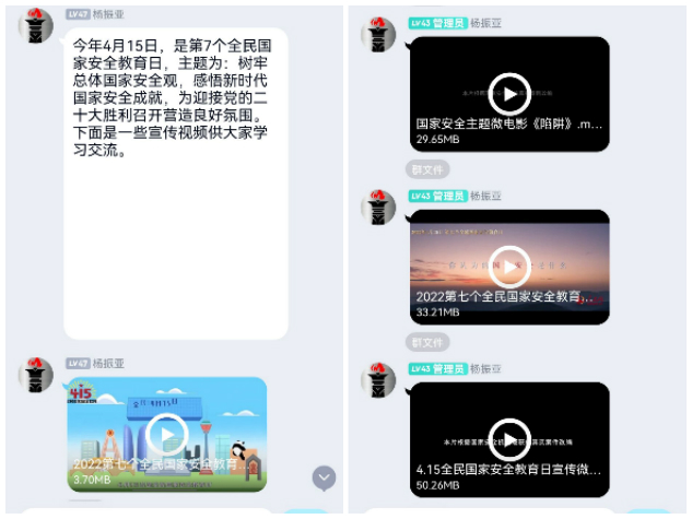 安全保卫处于4月15日在学校职工QQ群和学工管理QQ群推送了15个国家安全教育宣传视频,提高了广大职工安全防范的本领,把维护国家安全贯穿到日常的本职工作中;同时进一步加强了班主任、辅导员等学工队伍对beat365大学生的安全教育,实现安全教育横到边,纵到底,全员覆盖。