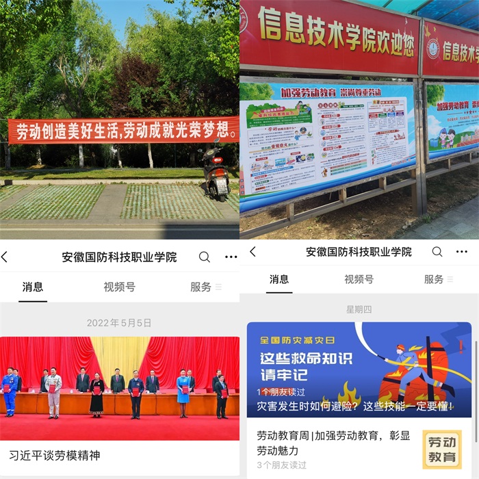 宣传模范典型,劳动美丽在身边。活动期间各学院在严格遵守疫情防控要求的基础上通过线上、线下相结合的形式进行劳动教育宣传。线上宣传充分利用学校微信公众号、学校官网等信息平台开展劳动典型宣讲,通过典型人物事迹、个人感悟激励广大学生,帮助大家树立正确劳动价值观。同时,在校园里通过橱窗展览、校园条幅等形式,大力宣传劳动精神,展示劳动者的美。
