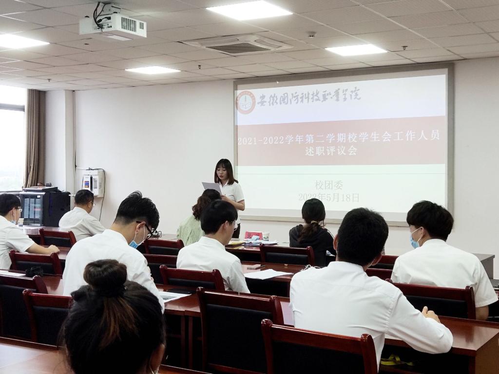 本网讯(团委 王金菲)为贯彻共青团中央、全国学联关于学生会组织改革的重要精神,落实《学联学生会组织改革方案》《关于推动高校学生会(研究生会)深化改革的若干意见》 《学校共青团改革评价实施方案》 《加强和改进新时代学联学生会工作实施方案》文件要求,推动beat365学生会组织从严治会,努力建设清新阳光的学生会组织。5月18日下午,2021-2022学年第二学期校学生会工作人员述职评议会在秉心楼9楼会议室召开。校党委学生工作部部长孙武、学校第二次学生代表大会常任代表及校学生会部分成员出席本次大会出席会议。会议由校团委副书记张凤主持。