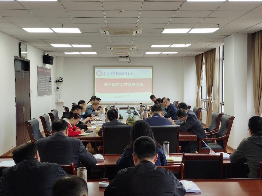 本网讯(党政办公室 陶常乐)为全面贯彻落实教育部安全工作视频会议精神和中共安徽省教育工委安全工作部署,扎实做好党的二十大重要保障期间校园安全稳定工作,确保校园安全。10月9日上午,学校在秉心楼11楼第一会议室召开安全稳定工作专题会议,校领导余嗣元、丁守宝、袁旗、李存鹏以及各部门和二级学院主要负责同志参加了会议,会议由校党委副书记、校长李麟书主持。
