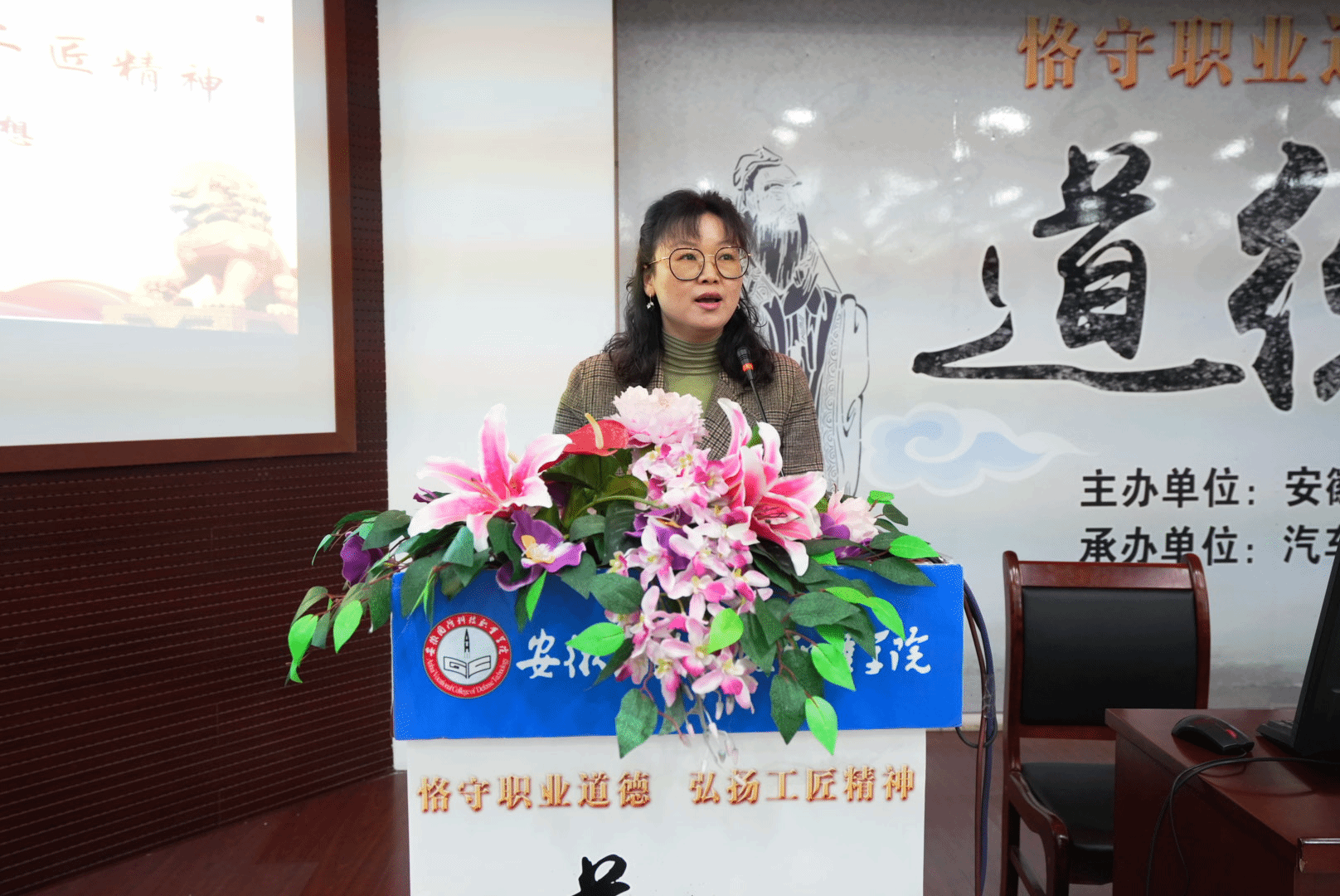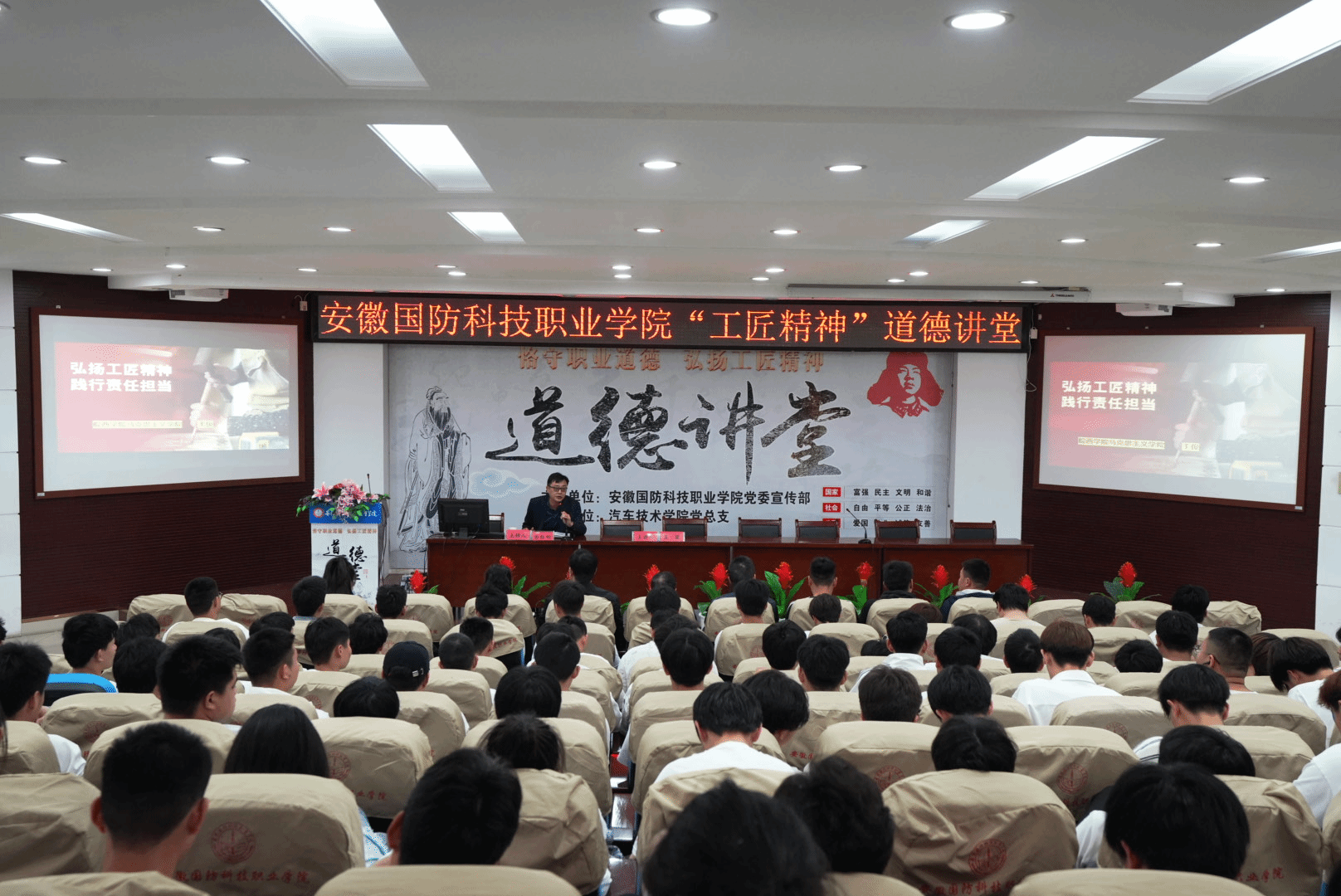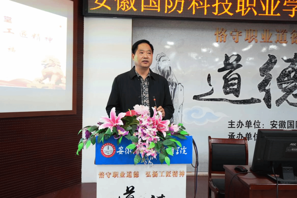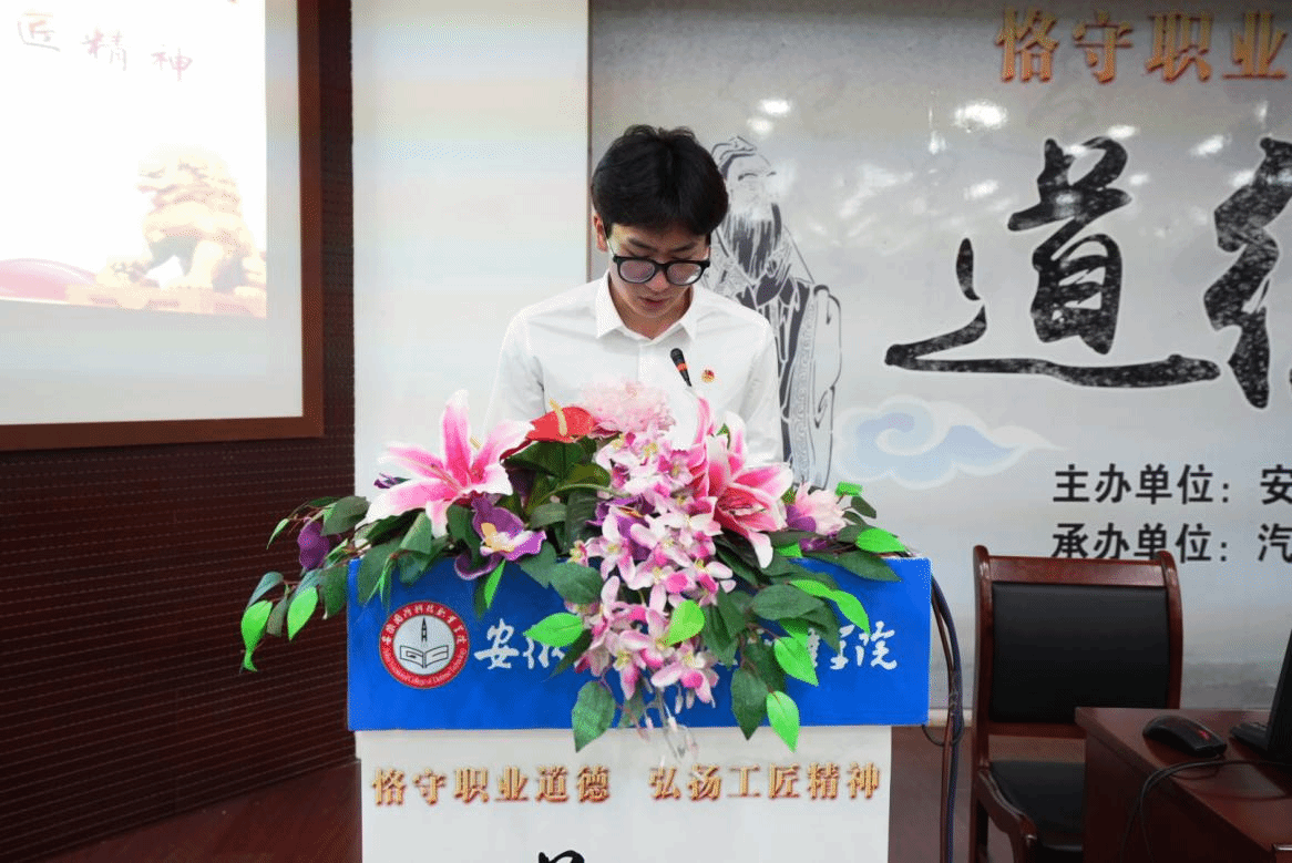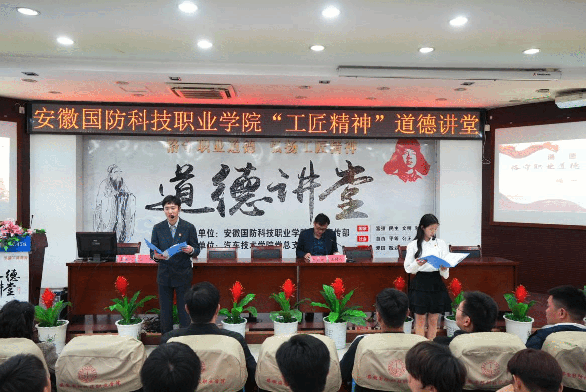 本网讯(汽车技术学院 徐婷婷)为深入学习贯彻习近平新时代中国特色社会主义思想和党的二十大精神,积极培育和践行社会主义核心价值观,引导师生增强文化自信,凝聚团结进取、奋发图强的精神力量,根据学校《关于开展2023年度“道德讲堂”和“我们的节日”活动的通知》文件精神,4月26日下午,由校党委宣传部主办、汽车技术学院党总支承办的以“恪守职业道德,弘扬工匠精神”为主题的道德讲堂活动在图书馆报告厅隆重举行。活动邀请了皖西学院王俊副教授作专题报告,校党委副书记冯伦久应邀出席活动,汽车技术学院党总支书记兼院长孙良平、副院长姜继文、团总支书记陈梦雅及全校120余名师生代表参加了此次活动,活动由党总支副书记余桂刚主持。