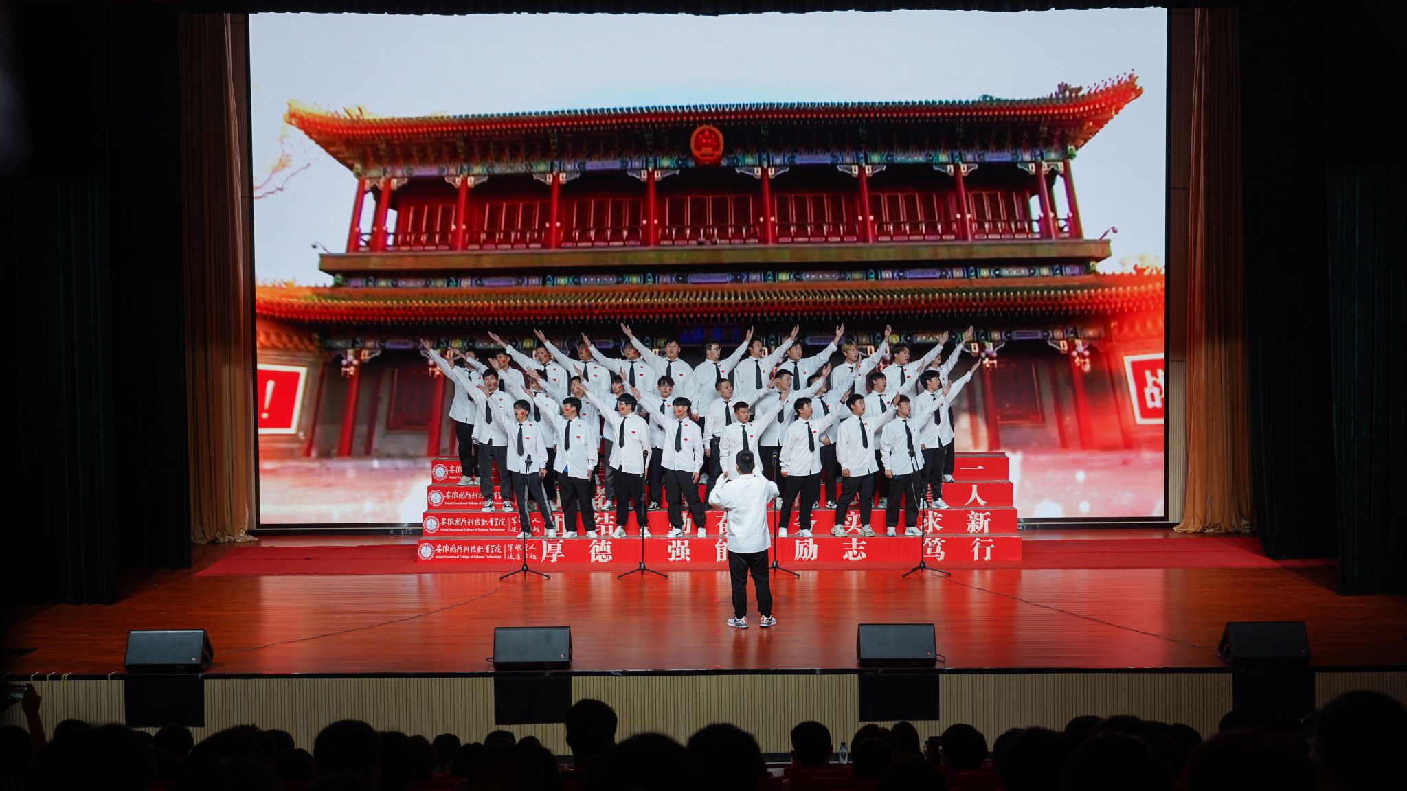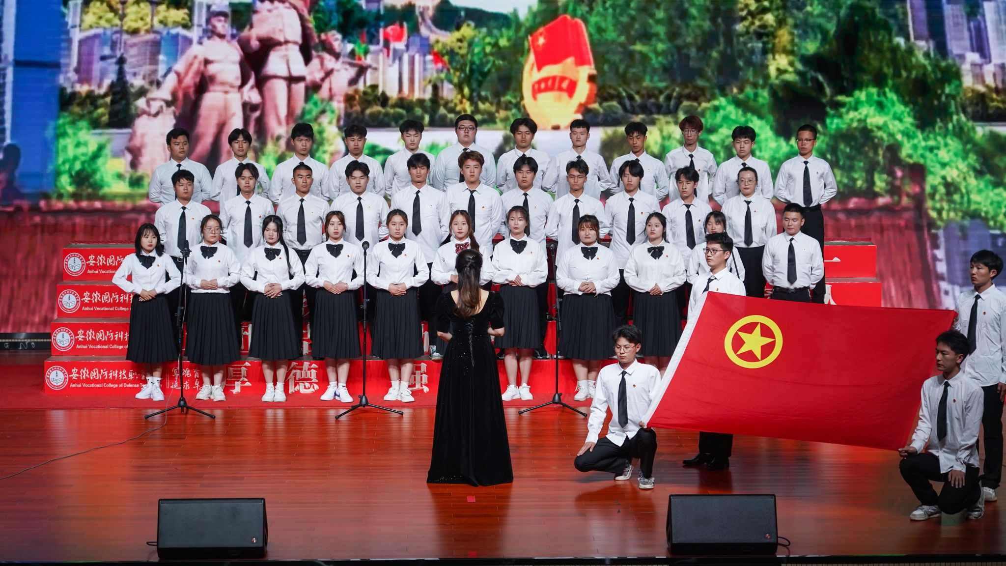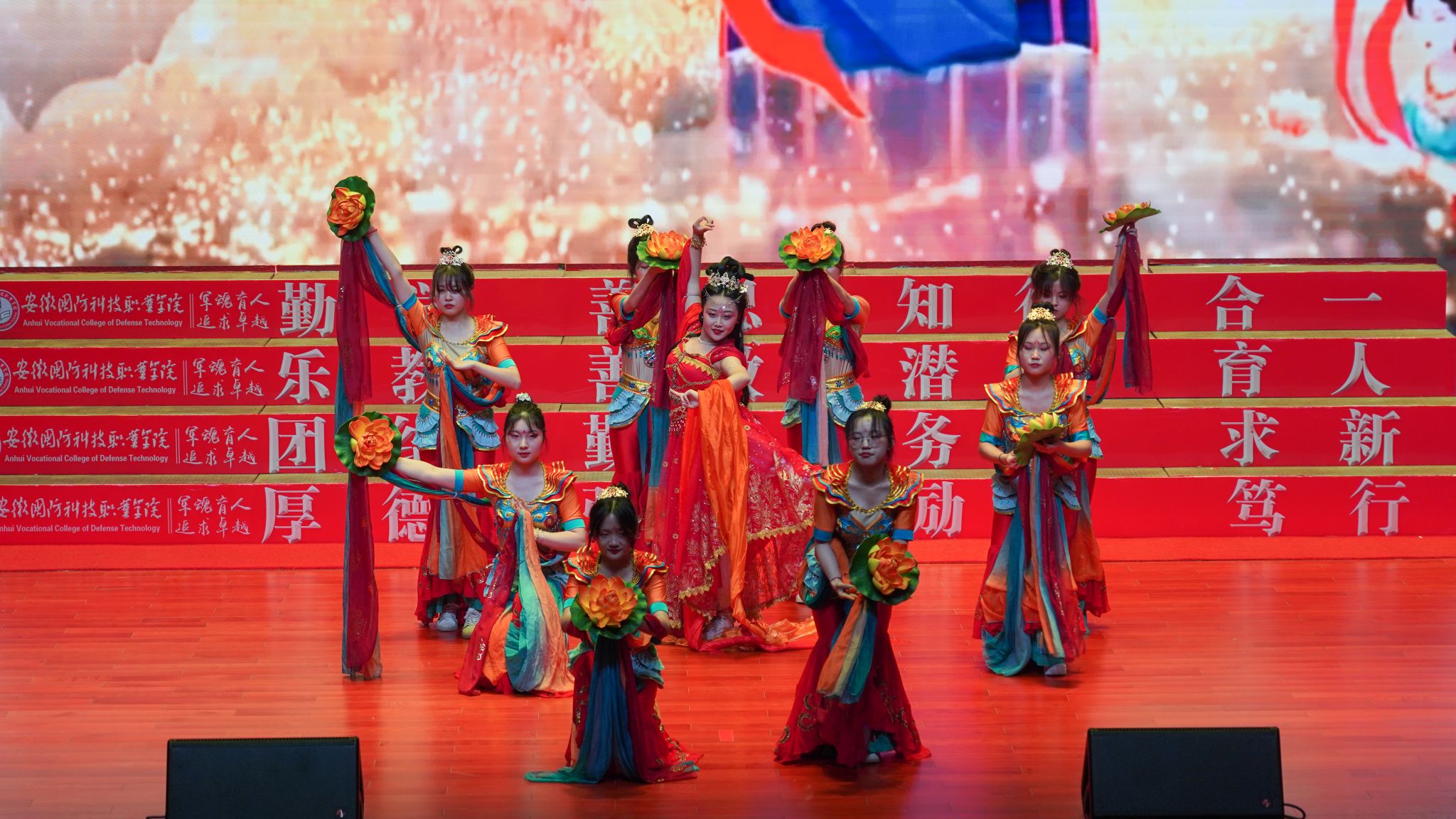 晚会共三个篇章,第一篇章以“初心不忘·团聚新时代”为主题。第一个上场的是汽车技术学院带来的合唱《我们走在大路上》,抒发了中国共产党带领中国人民敢教日月换新天的蓬勃斗志,充分展现国防学子满腔热血之情。经贸管理学院带来的合唱《祖国不会忘记》,雄壮有力、刚健豪迈,带领现场师生回忆辉煌事业背后的人物和故事,告诉我们功成不必在我,功成必定有我,要将理想融入祖国的宏伟壮志当中。信息技术学院带来的《歌唱祖国》,唱出国防学子对祖国母亲的依恋之心,从校园的青春激情转变为爱国的豪迈之情,为祖国歌唱,同时也是在歌唱梦想,歌唱新时代!大学生艺术团带来的胡璇舞《梦回敦煌》,动作轻盈舒展,神情悠闲自得,展现了中华优秀传统文化的独特魅力。