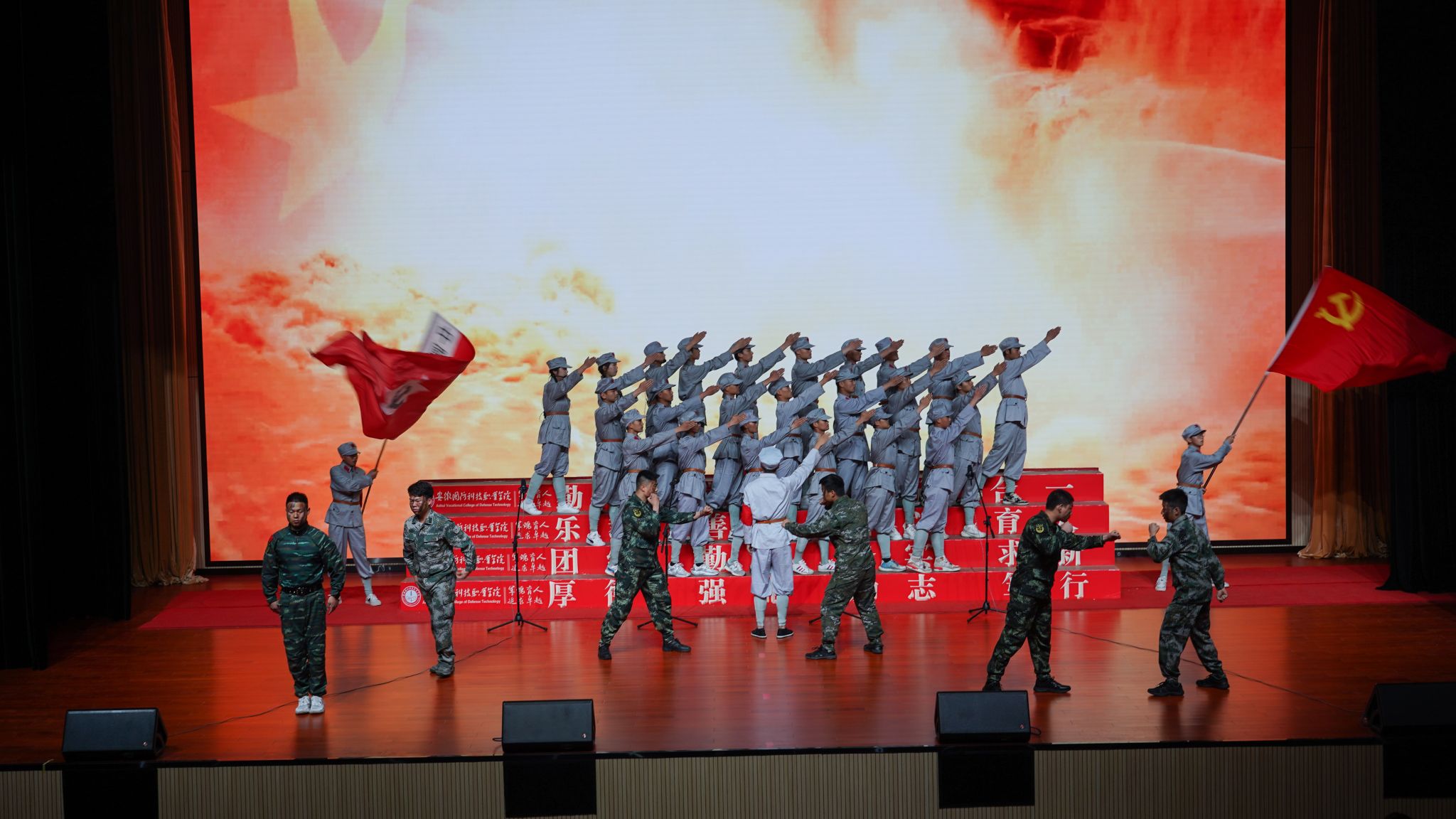 本次五四青春歌会共有来自各二级学院、团学组织的十支队伍参赛。首先由体育舞蹈俱乐部带来的开场舞《奔跑的青春》,瞬间点燃了全场气氛,展现国防青年的激情与活力。社团管理部带来的情景朗诵《我们的青年时代》拉开了本次大会的序幕,重现了当时热血青年的拳拳爱国心,殷殷爱国情,以及内心的责任感和使命感。