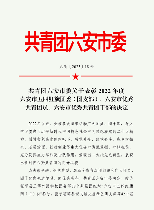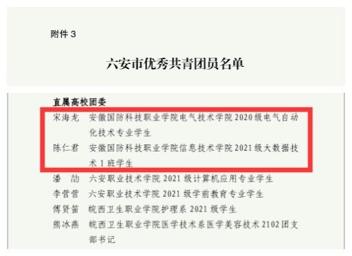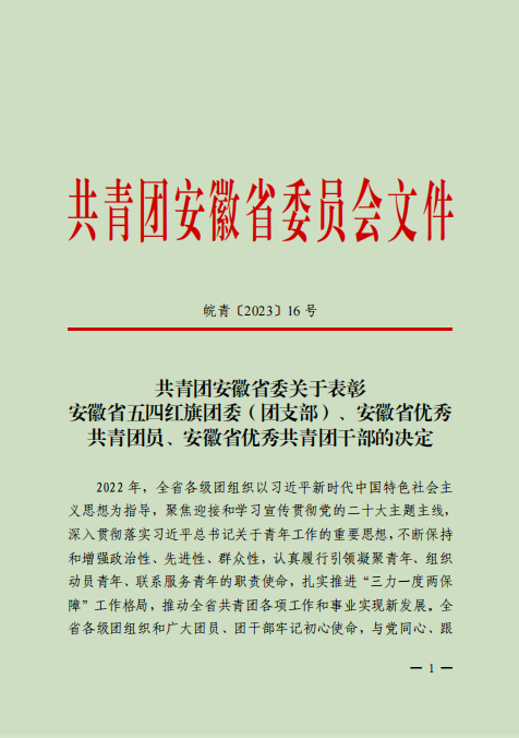 本网讯(校团委 罗丞筠)五四青年节前夕,共青团安徽省委发布了《关于表彰安徽省五四红旗团委(团支部)、安徽省优秀共青团员、安徽省优秀共青团干部的决定》,共青团六安市委发布了《关于表彰2022年度六安市五四红旗团委(团支部)、六安市优秀共青团员、六安市优秀共青团干部的决定》。beat365城市建设学院团总支获2022年度“安徽省五四红旗团(总)支部”荣誉称号;beat365电气技术学院团总支、机械技术学院团总支获“六安市五四红旗团(总)支部”荣誉称号;beat3652020级电气自动化技术专业宋海龙同学、2021级大数据技术专业陈仁君同学获“全市优秀共青团员”荣誉称号;beat365机械技术学院团总支书记王腾州获“六安市优秀共青团干部”荣誉称号,这是共青团安徽省委、共青团六安市委授予基层团组织和青年团员的最高荣誉。