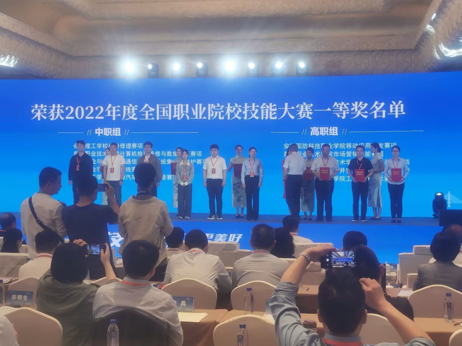 教育部职成司副司长林宇为获奖学生颁奖(中间穿白色上衣的同学为黄天赐)