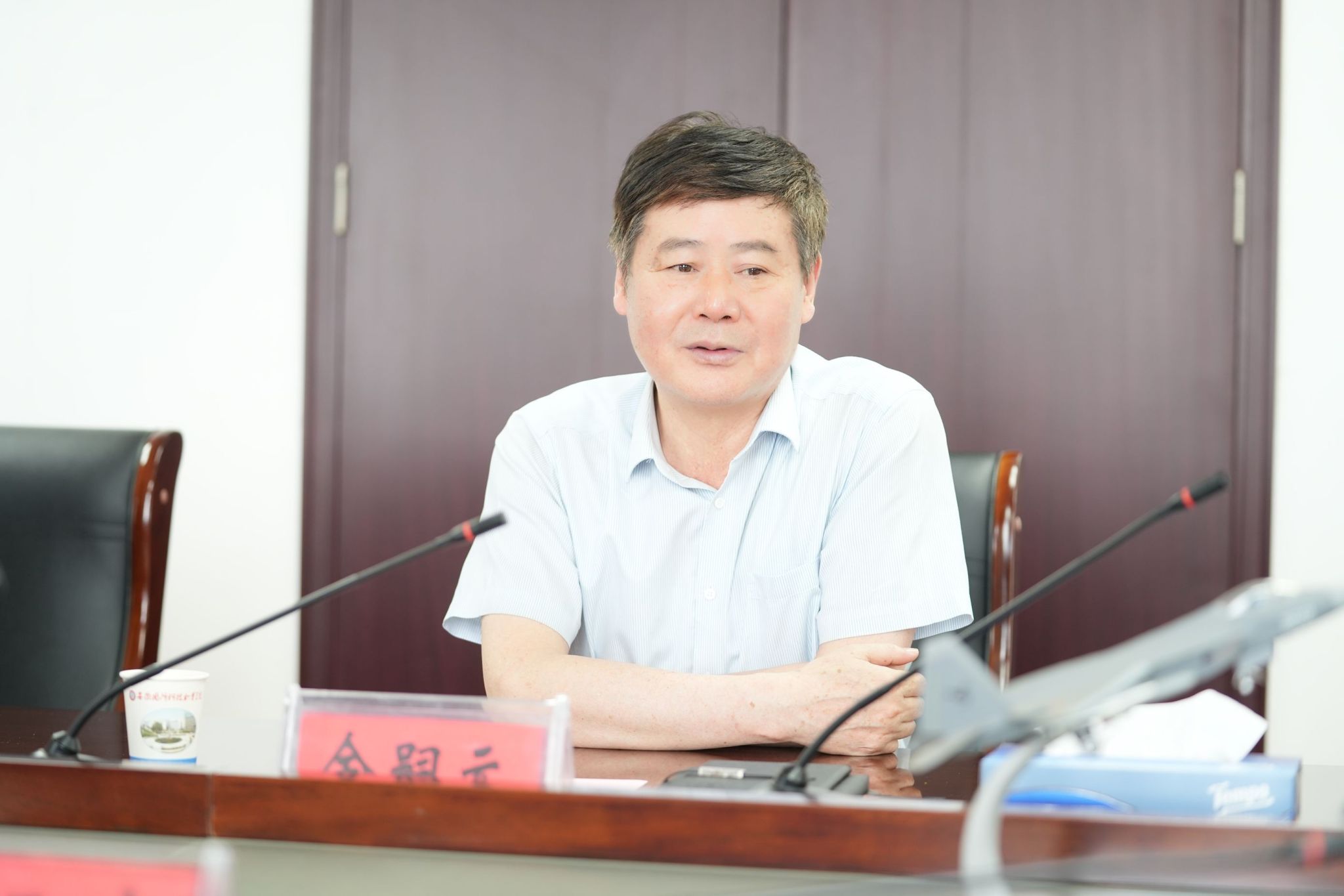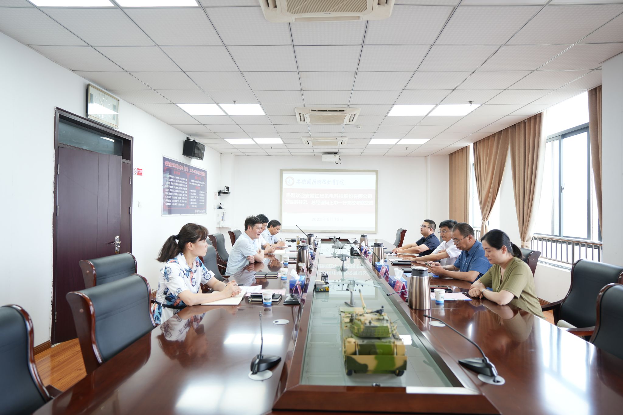 本网讯(党政办 马乃宇)6月16日上午,安徽红星机电科技股份有限公司党委副书记、总经理何正中一行来校调研军工展厅建设相关工作,校党委书记余嗣元,党委委员、副校长袁旗,党委委员、工会主席黄存东,纪委副书记、纪委办主任陈兆同,团委副书记张凤参加调研座谈会。