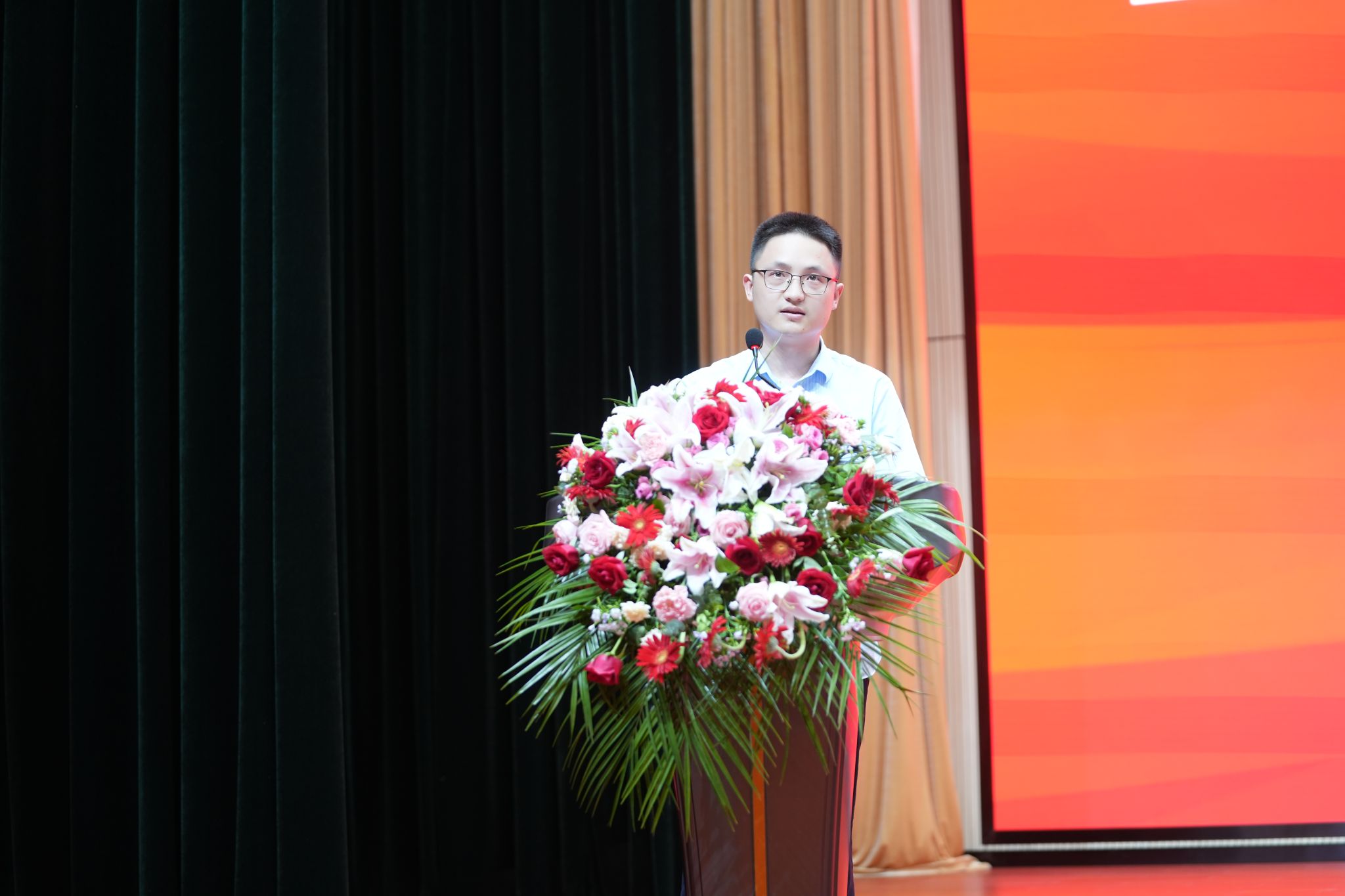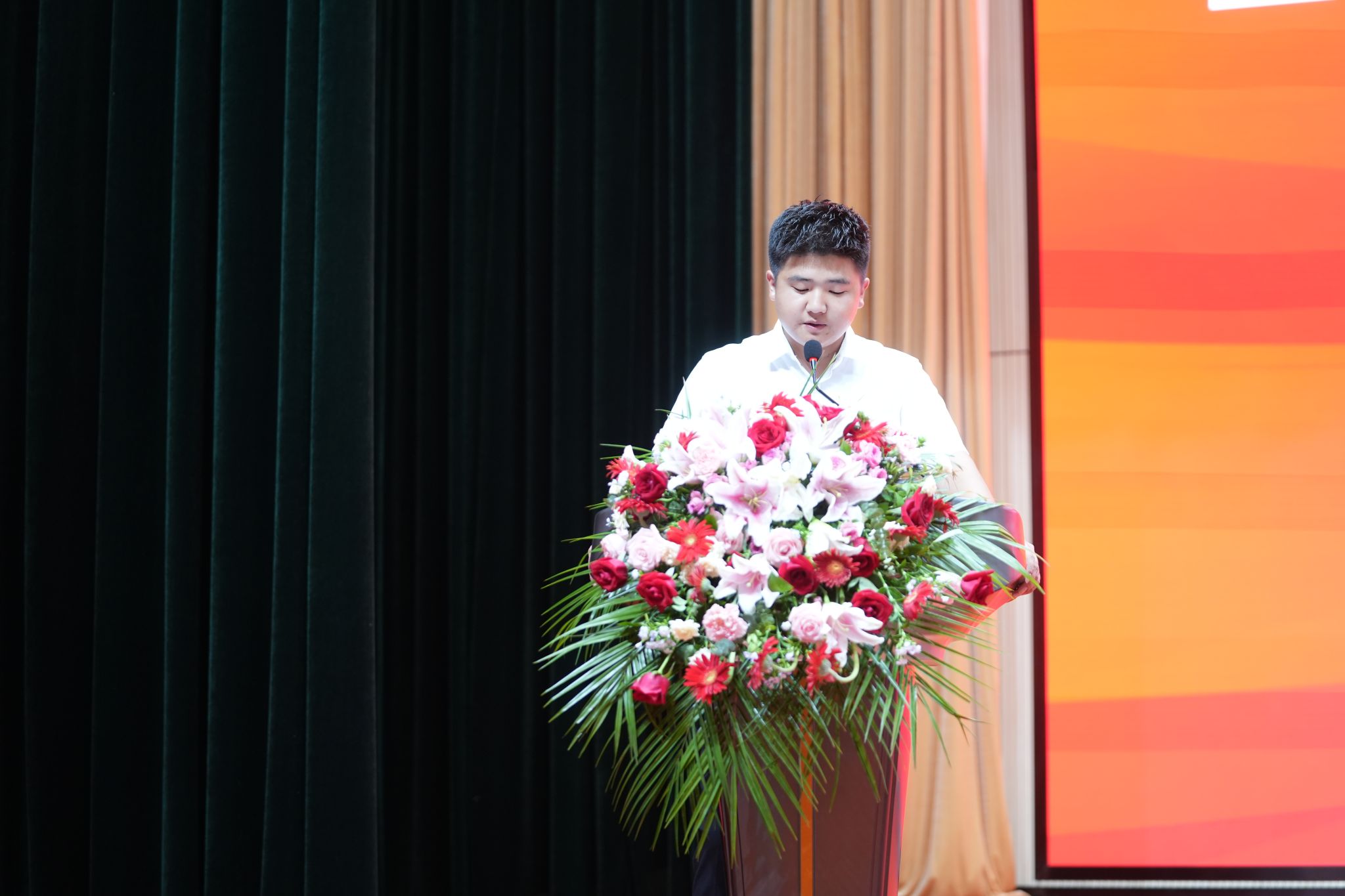 殷殷恩师情,浓浓学子意。同学们犹记得在披荆斩棘、勇毅前行的求学路上,无论是课堂上的谆谆教导,还是课堂外的一次次关心、一声声叮嘱、一句句祝福,敬爱的老师始终与同学们并肩同在。而今天,这些记忆都将化作青春的印记,成为漫漫人生中的美好的点缀,激励着同学们不断前行。学生代表满怀感激之情,将最美的鲜花献给最美的老师。