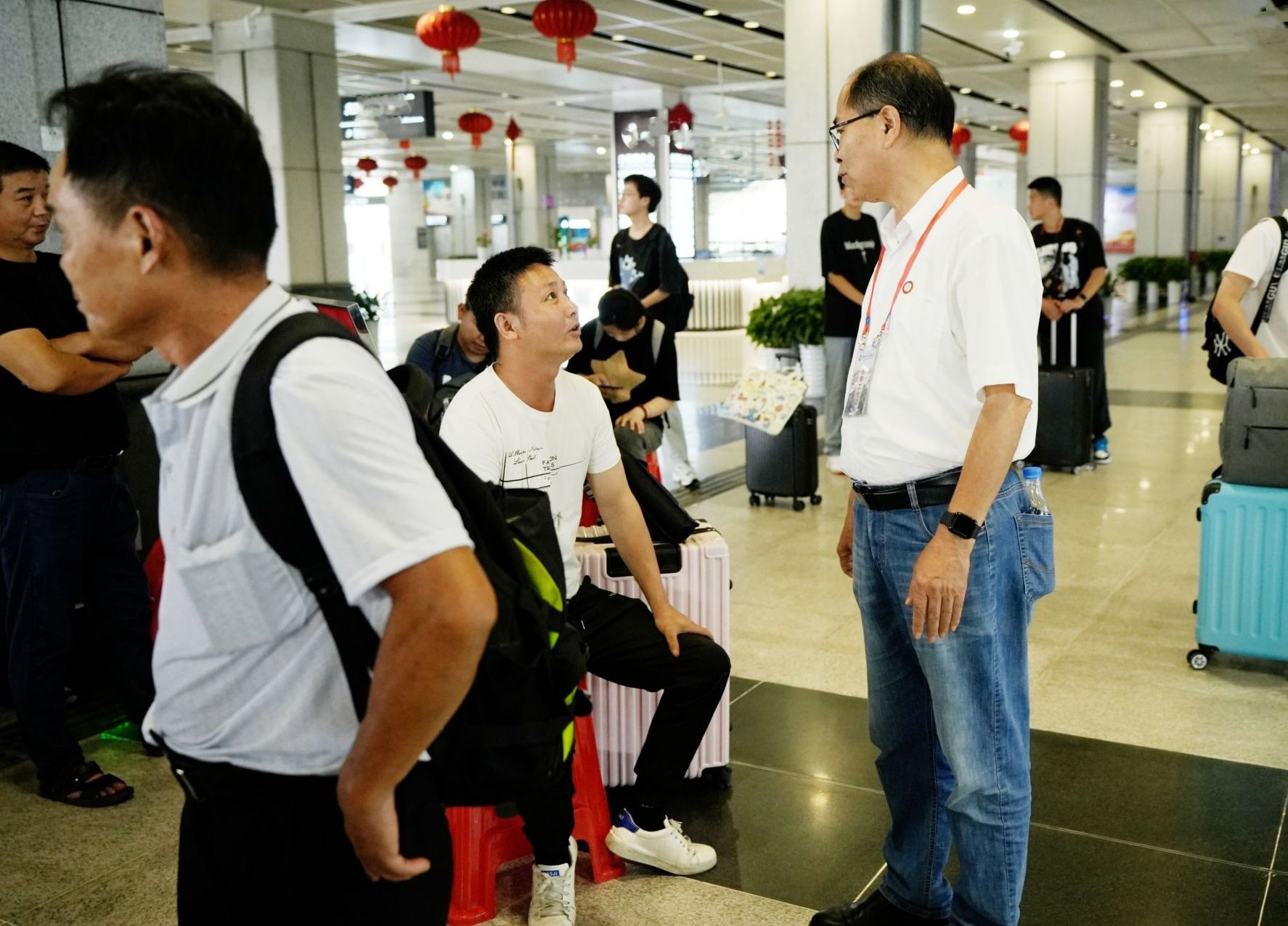 校长李麟书(右一)在高铁站接待处与新生家长亲切交谈