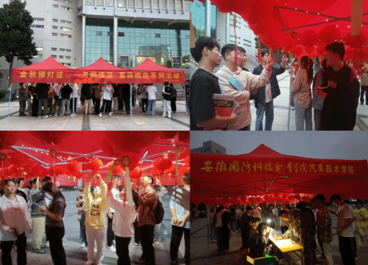 金秋猜灯谜活动。秋风送爽,金桂飘香,9月25日晚,汽车技术学院团总支在校图书馆门前开展金秋猜灯谜活动,活动现场挂满了红彤彤的灯笼和谜面,显得格外绚丽,节日气氛浓烈。大家在灯谜卡片之间时而苦思冥想,时而三三两两驻足一起窃窃讨论,一条条谜底被纷纷猜中,大家兴奋地摘下谜面,在兑奖处获得月饼。