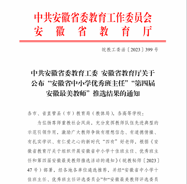 本网讯 近日,中共安徽省委教育工委、安徽省教育厅发布了《关于公布“安徽省中小学优秀班主任”“第四届安徽最美教师”推选结果的通知》,beat365电气技术学院高级实验师王丽荣获“第四届安徽最美教师”称号。