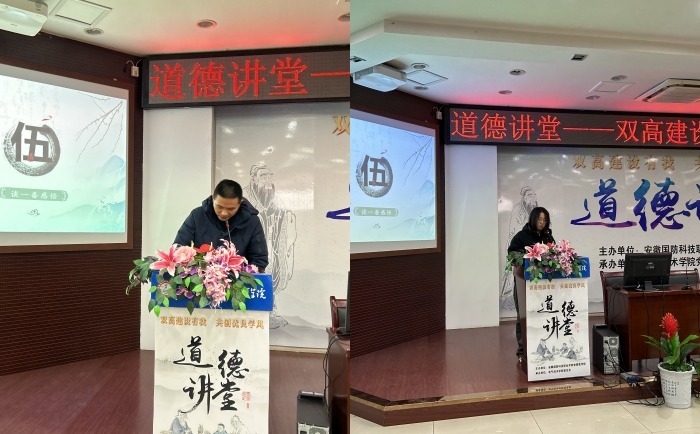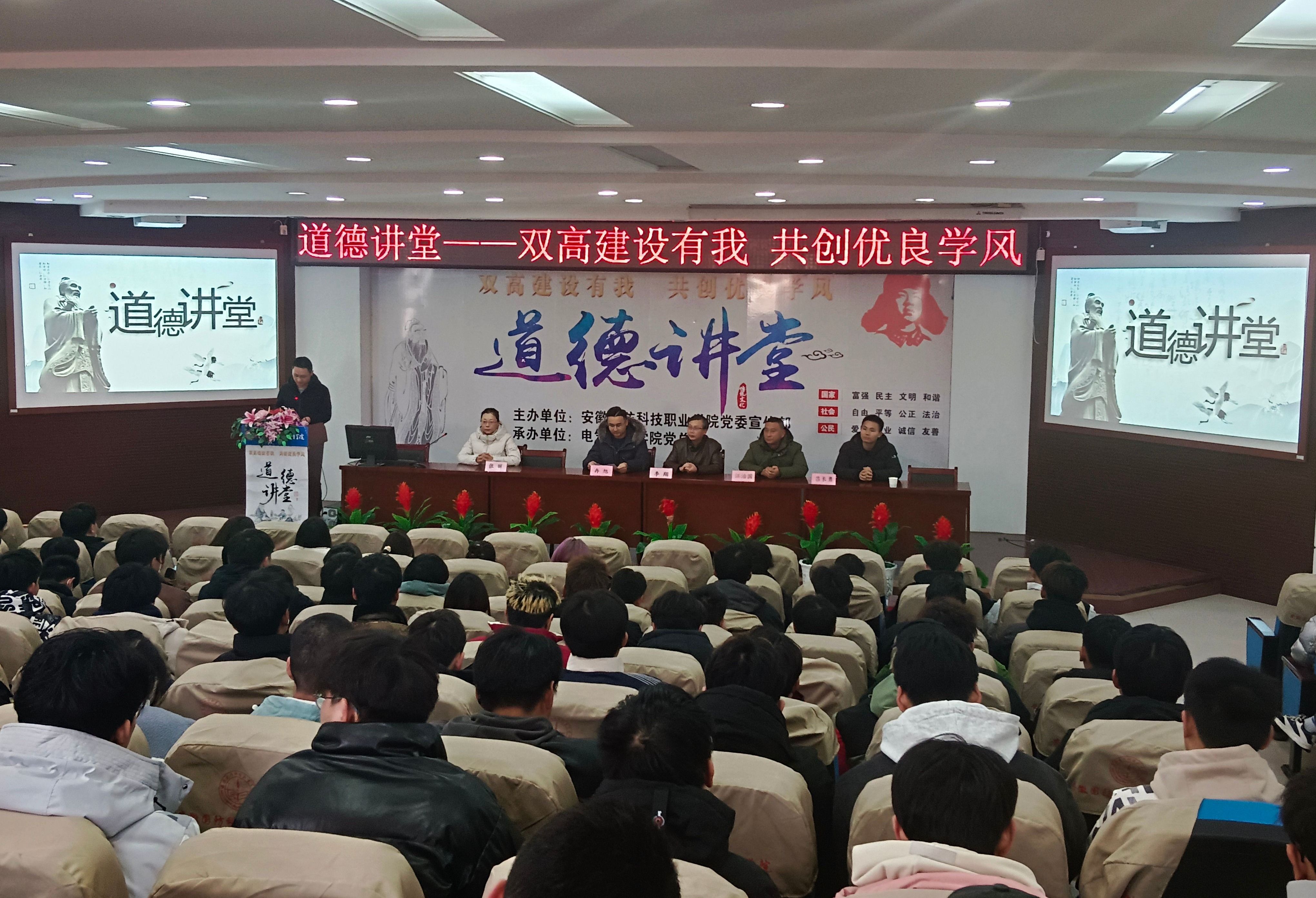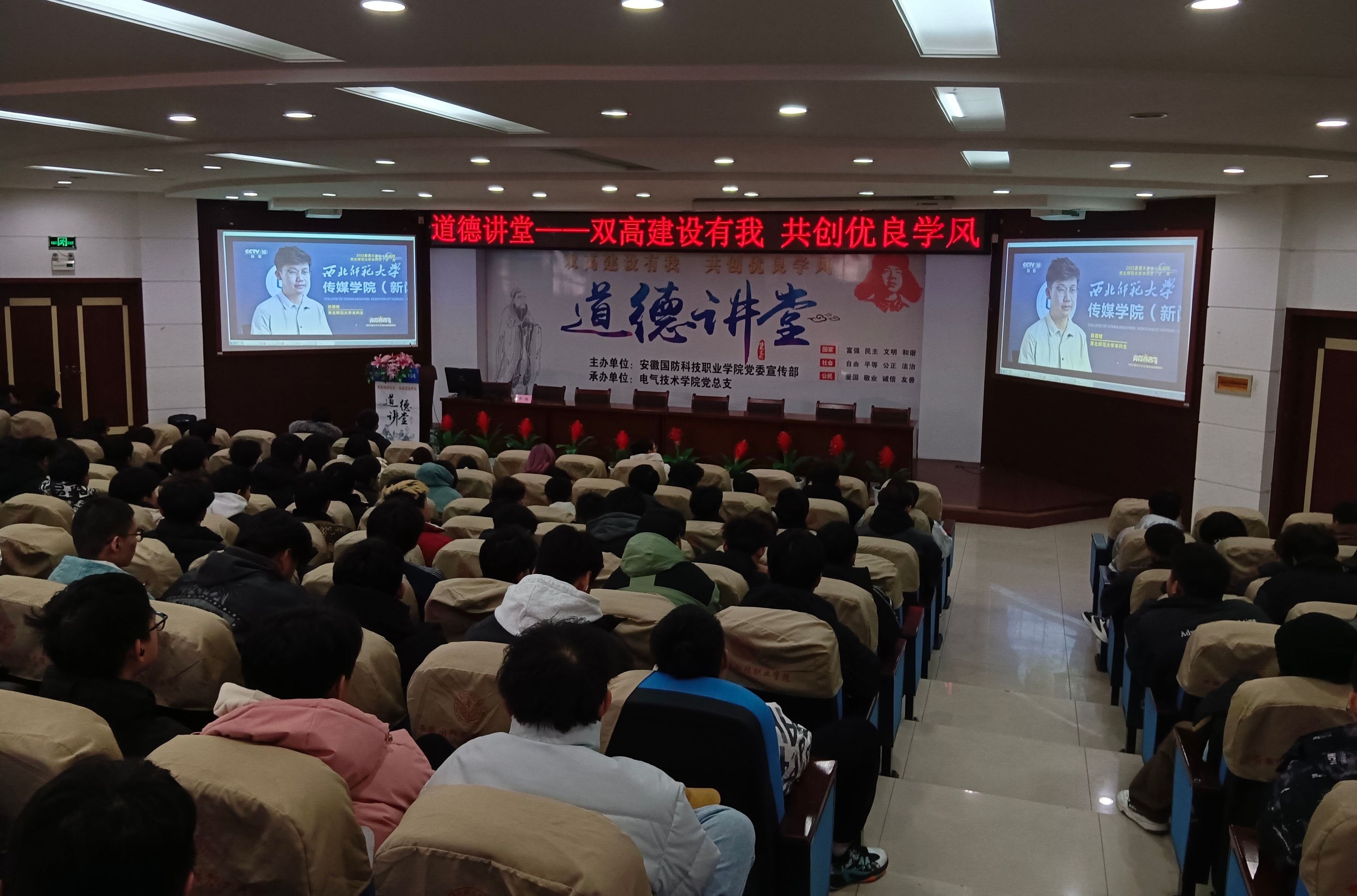 本网讯(电气技术学院 陈俊)为全面落实立德树人根本任务,扎实推进“双高”建设,不断提升人才培养质量,进一步加强学风建设,在广大师生中营造创先争优的良好学风,12月20日下午,由校党委宣传部主办、电气技术学院承办的“双高建设有我 共创优良学风”道德讲堂在校图书馆报告厅隆重举行。电气技术学院院长李翔、学院党总支副书记张丽、学院副院长江治国、皖西学院电气与光电工程学院团委副书记吕长勇、电气技术学院全体辅导员和全校近200名学生代表参加了此次活动。