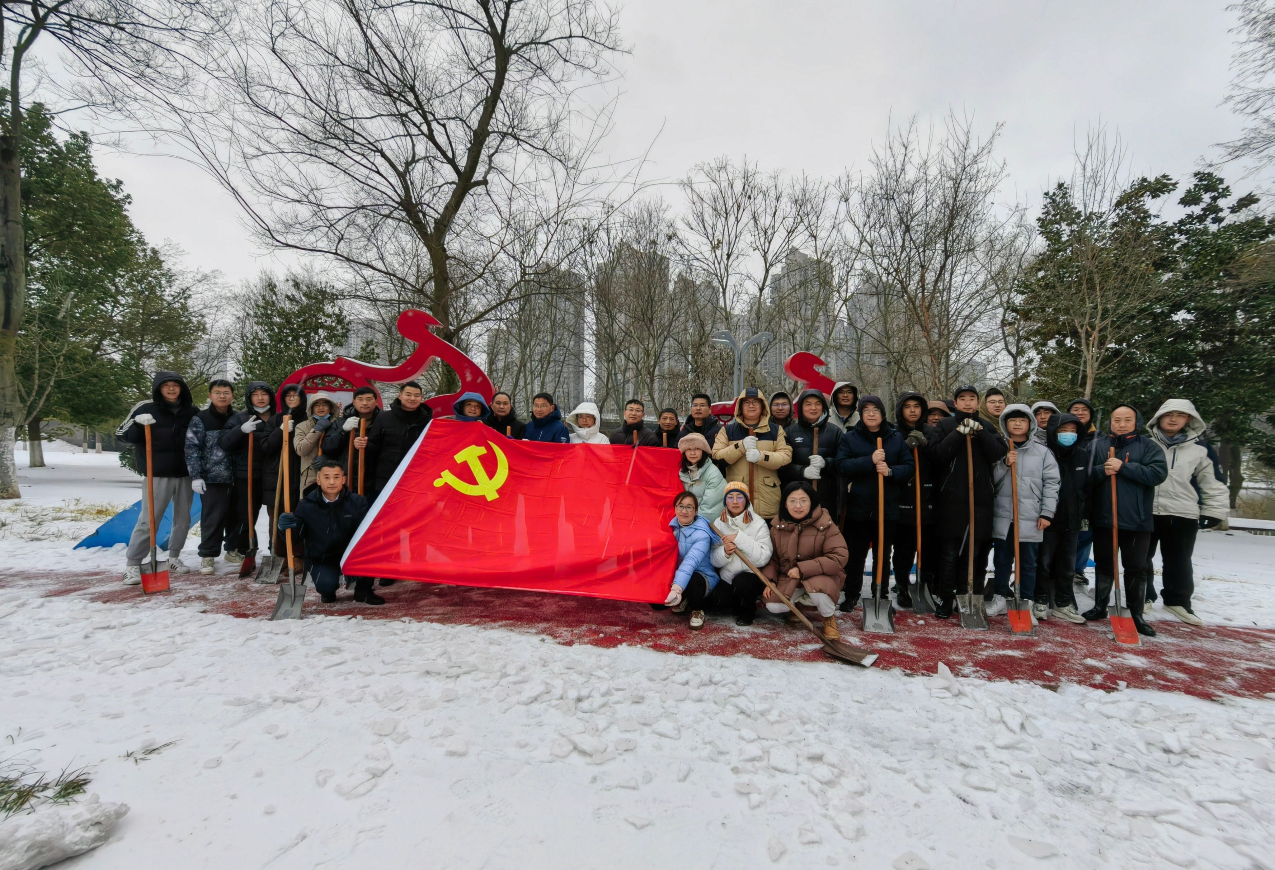 众力举则坚冰破,道路畅以民心和。在清扫过程中,由于气温较低,雪下得又很大,清扫工作十分困难,党员志愿者手和脸被冻得通红,但这丝毫没有影响大家扫雪除冰的热情和工作效率。除雪志愿小队还摸索出一条针对主要出行干道的扫雪“流水线”工作法。“前2个人打头阵用雪橇背面砸冰,再来1人用雪锹推冰。”大家躬着身子,握紧扫把铁锹,团结协作,演奏出“咣咣咔咔嚓嚓”的扫雪铲雪“进行曲”。很快,道路就“现”出了“原貌”,用“小行动”保障了“大民生”,在料峭的春寒里增添了一份温暖和力量。