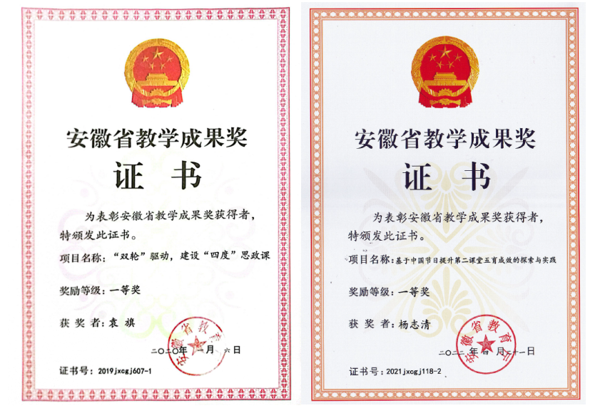 在教学改革中总结提炼经验,获批安徽省教学成果一等奖2项。一是聚焦思政课课堂主渠道,实施 “双轮驱动,建设四度思政课”教学改革,即持续开展“质量思政、书香思政、温馨思政”活动、实施《思政课学习与实践手册》制“双轮”驱动,着力建设“高度、温度、信度、效度”四位一体的“四度”思政课,持续提升了思政课的思想性、理论性和亲和力、针对性。另一个是拓展“第二课堂”新空间,实施“基于中国节日提升第二课堂五育成效的探索与实践”,以中国传统和现代节日为载体,将全年第二课堂的主要活动串联起来,将马克思主义中国化时代化理论成果与中国优秀文化融合起来,增强第二课堂活动的系统性、思想性,实现了第二课堂活动的价值引领性。