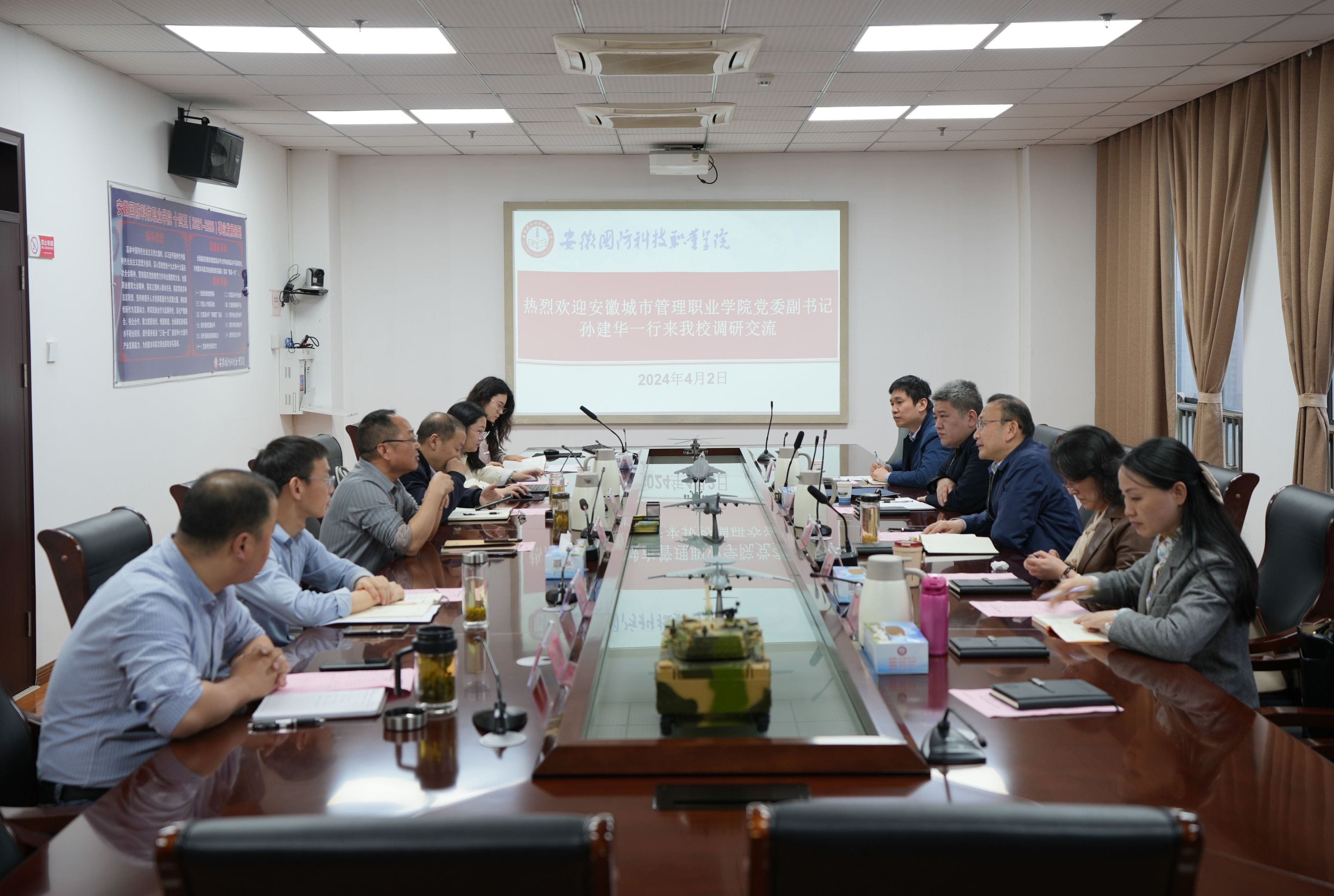 本网讯(组织人事处 孙佳)4月2日上午,安徽城市管理职业学院党委副书记孙建华一行来beat365就绩效工资改革及部门综合考核工作开展调研交流。校党委副书记冯伦久及相关部门负责人出席会议,会议由冯伦久主持。
