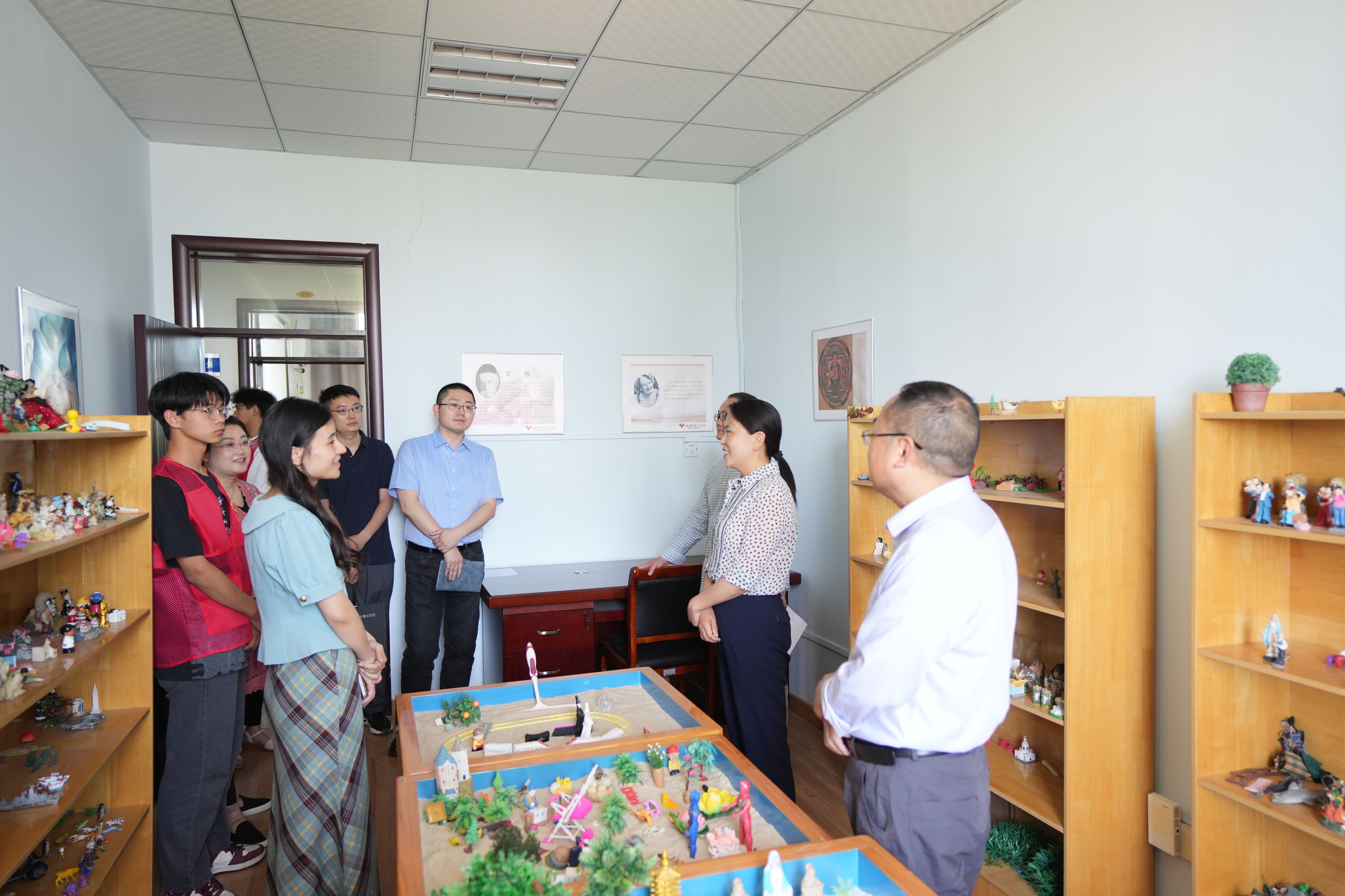调研期间,罗伟伟一行参观了心理咨询室、心理沙盘室、协会活动室,并在参观过程中,听取了蓝曦心理协会活动开展情况以及社团在学校心理健康工作中的作用发挥情况。