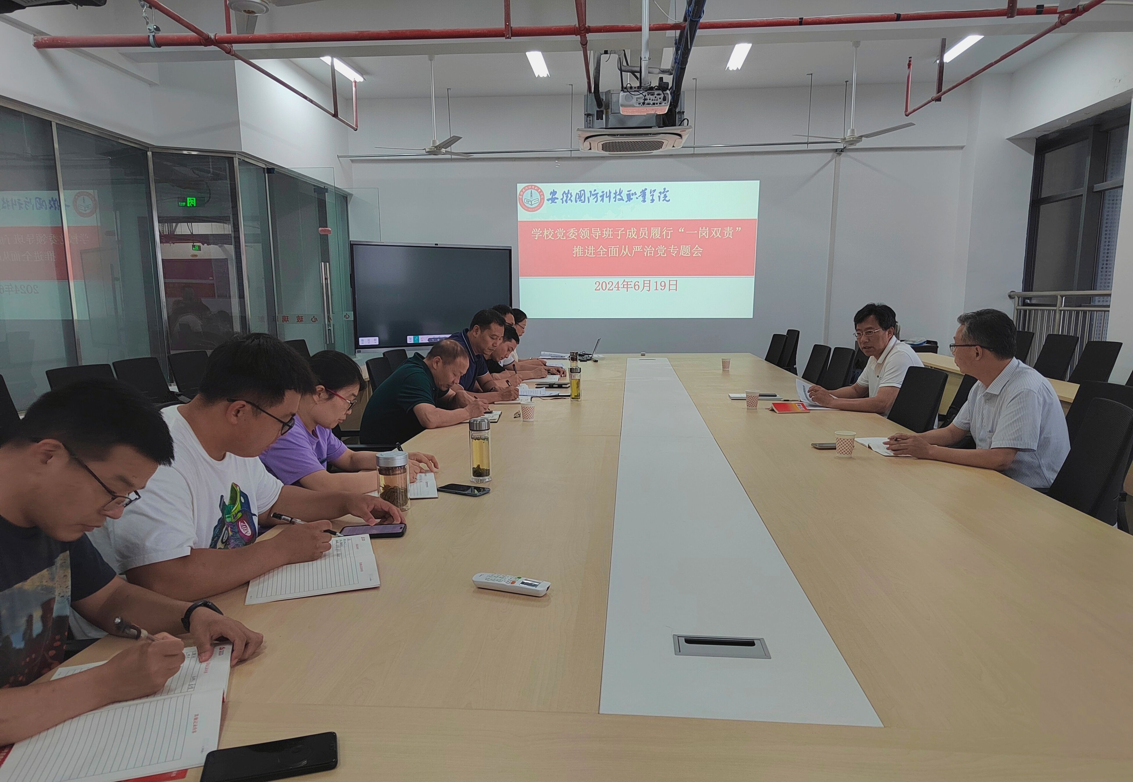 本网讯(电气技术学院 程坤)为了认真贯彻落实有关文件精神,推进全面从严治党,6月19日下午,副校长袁旗在产教融合中心3楼会议室主持召开履行“一岗双责”推进全面从严治党专题会,电气技术学院党总支班子及其所属党支部委员、财务处党支部委员、总务处党支部委员以及部分党员代表参加了会议。