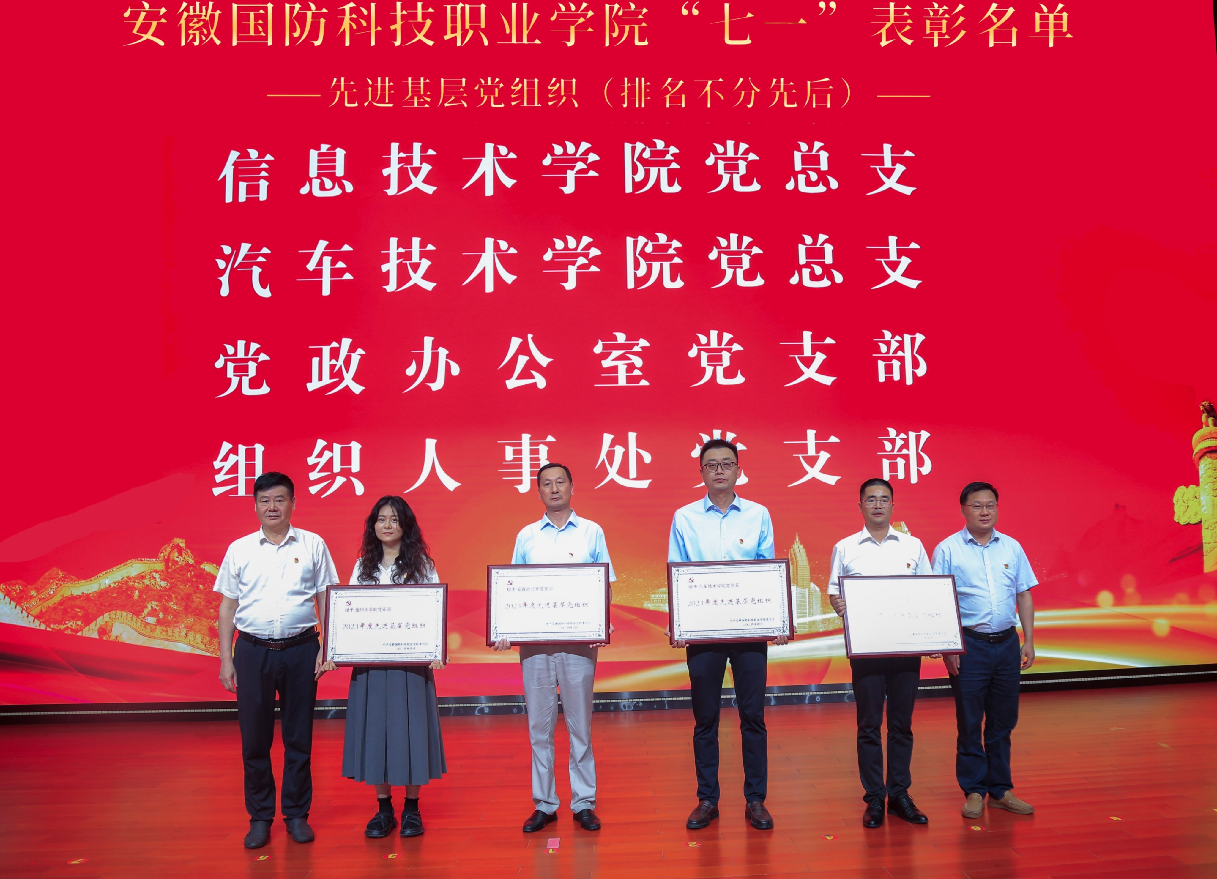 在热烈气氛中,学校表彰了2023年度“先进基层党组织”“优秀共产党员”“优秀党务工作者”,并为获得先进的基层党组织颁发奖牌,为“优秀共产党员”代表和“优秀党务工作者代表颁发荣誉证书,为学校“双带头人”教师党支部书记工作室授牌。