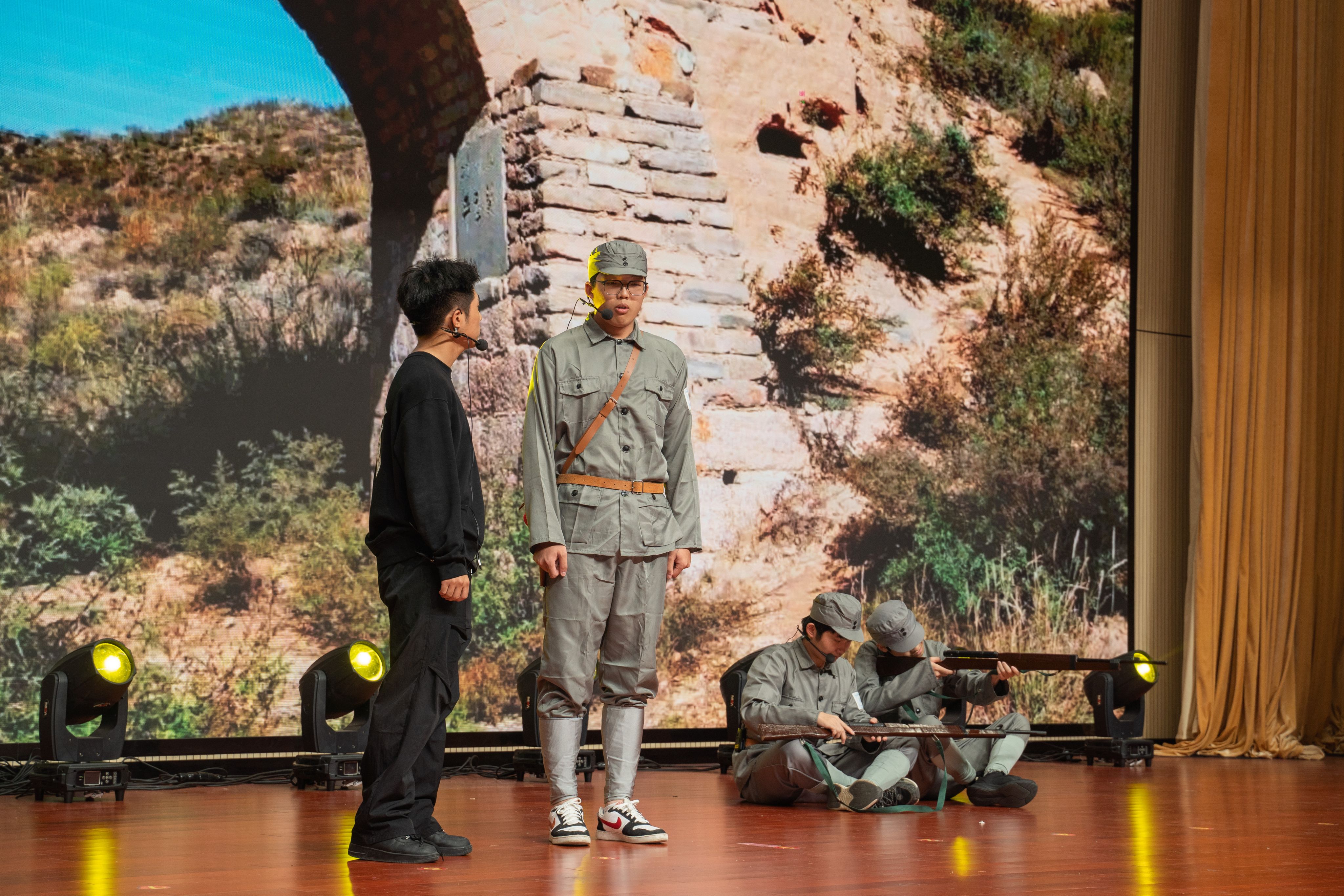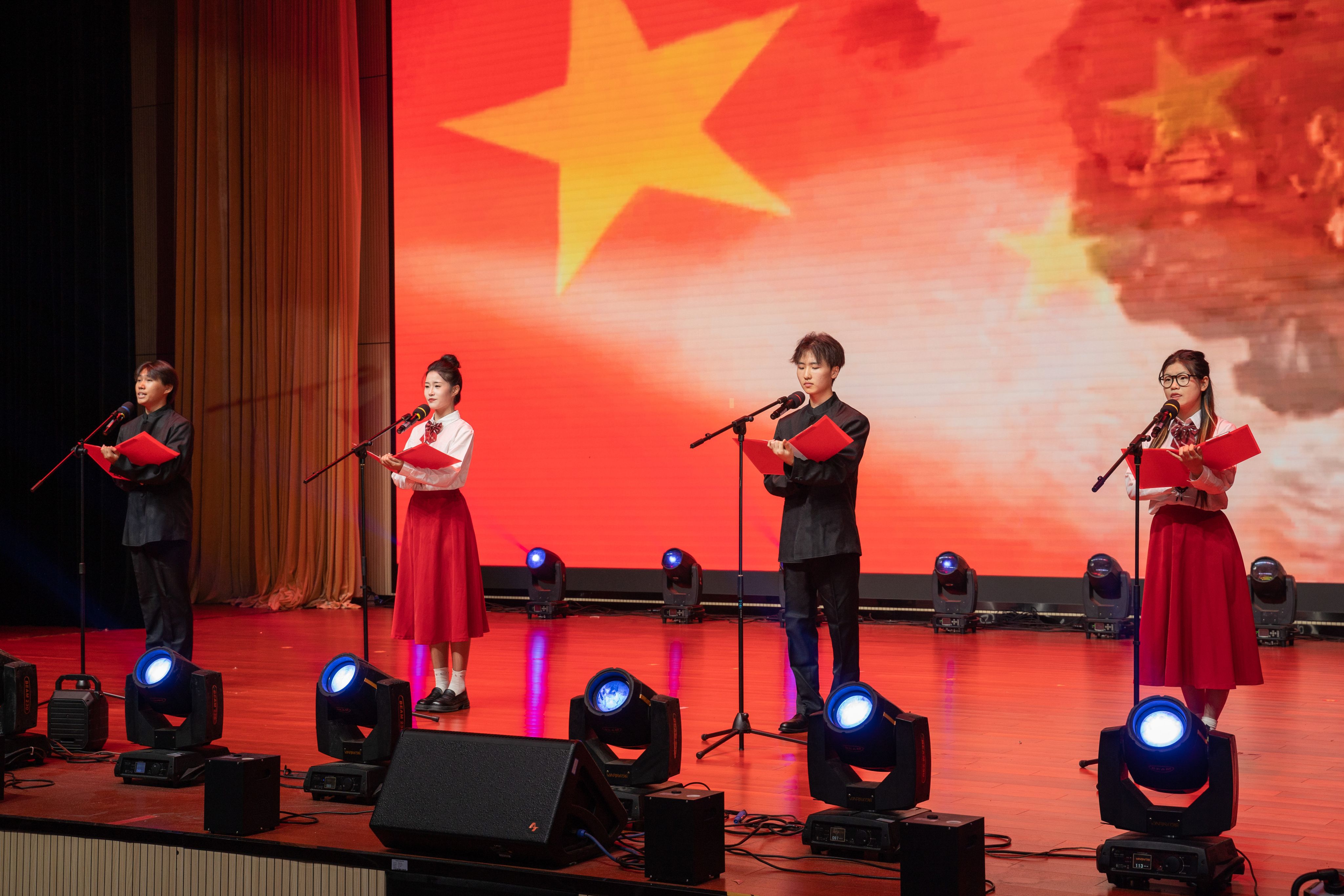 第三篇章“携手共进”。朗诵《国歌响起》字字铿锵有力,句句饱含深情,展现了强烈的爱国情怀与民族自豪感。匕首操《军武》国旗护卫队的队员们身着统一制服,动作整齐划一,表演匕首操,展现力量与技巧,气势恢宏,场面震撼。舞台剧《真的!就是真的!》剧情扣人心弦,表演生动传神,赢得观众阵阵掌声。歌伴舞《万疆》演员们身着华服,随着悠扬的旋律起舞,深情而壮美,展现了beat365学子的青春风采与爱国情怀。