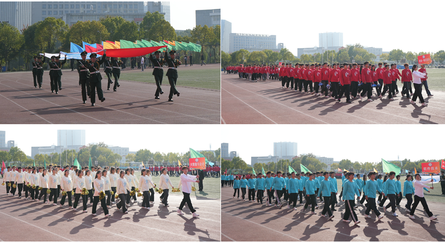 伴随着《运动员进行曲》铿锵有力的旋律,国旗护卫队的同学们簇拥着国旗、校旗和校运会会徽迈着整齐的步伐依序通过出席台;在彩旗队的引导下,六个二级学院代表队、裁判员代表队组成整齐有序的方阵。