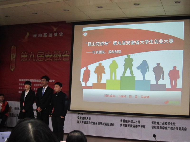 本网讯(党政办 王成名)12月13-14日,“昆山花桥杯”第九届安徽省大学生职业生涯规划大赛暨大学生创业大赛总决赛在安徽建筑大学举行。经过激烈角逐,我院代表队(由王振科、苏康健、田蒙3名学生组成,王成名、杨庆颖两位老师指导)最终斩获“安徽省大学生创业之星(金奖)”,学院荣获“最佳组织奖”。