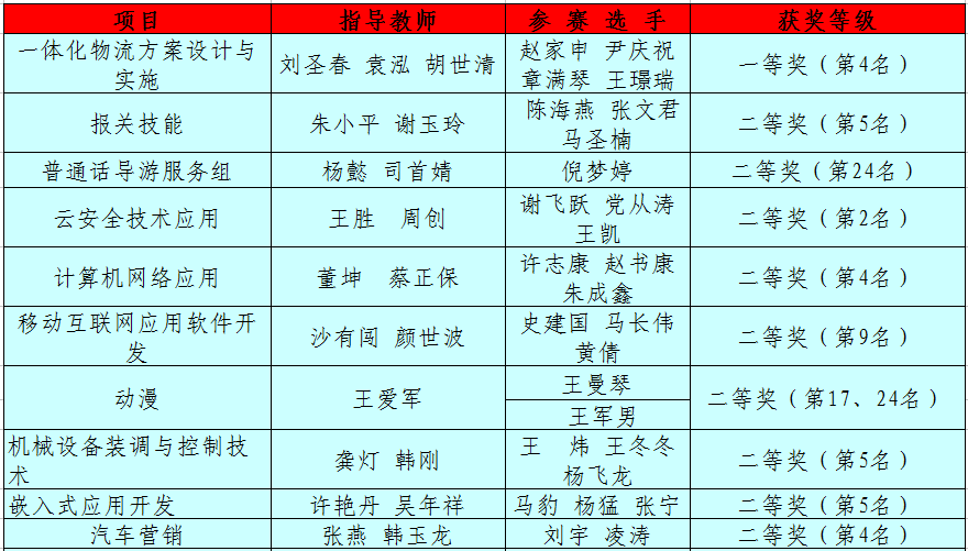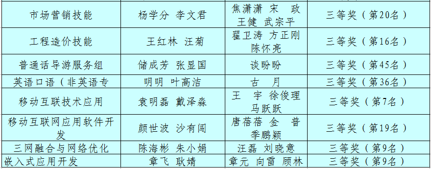 近日,从安徽高教网获悉,我院在2014年安徽省职业院校技能大赛中获得佳绩。本次大赛,我院共有34个队参加22个项目比赛,斩获一等奖1个、二等奖10个、三等奖19个。获奖名单如下: