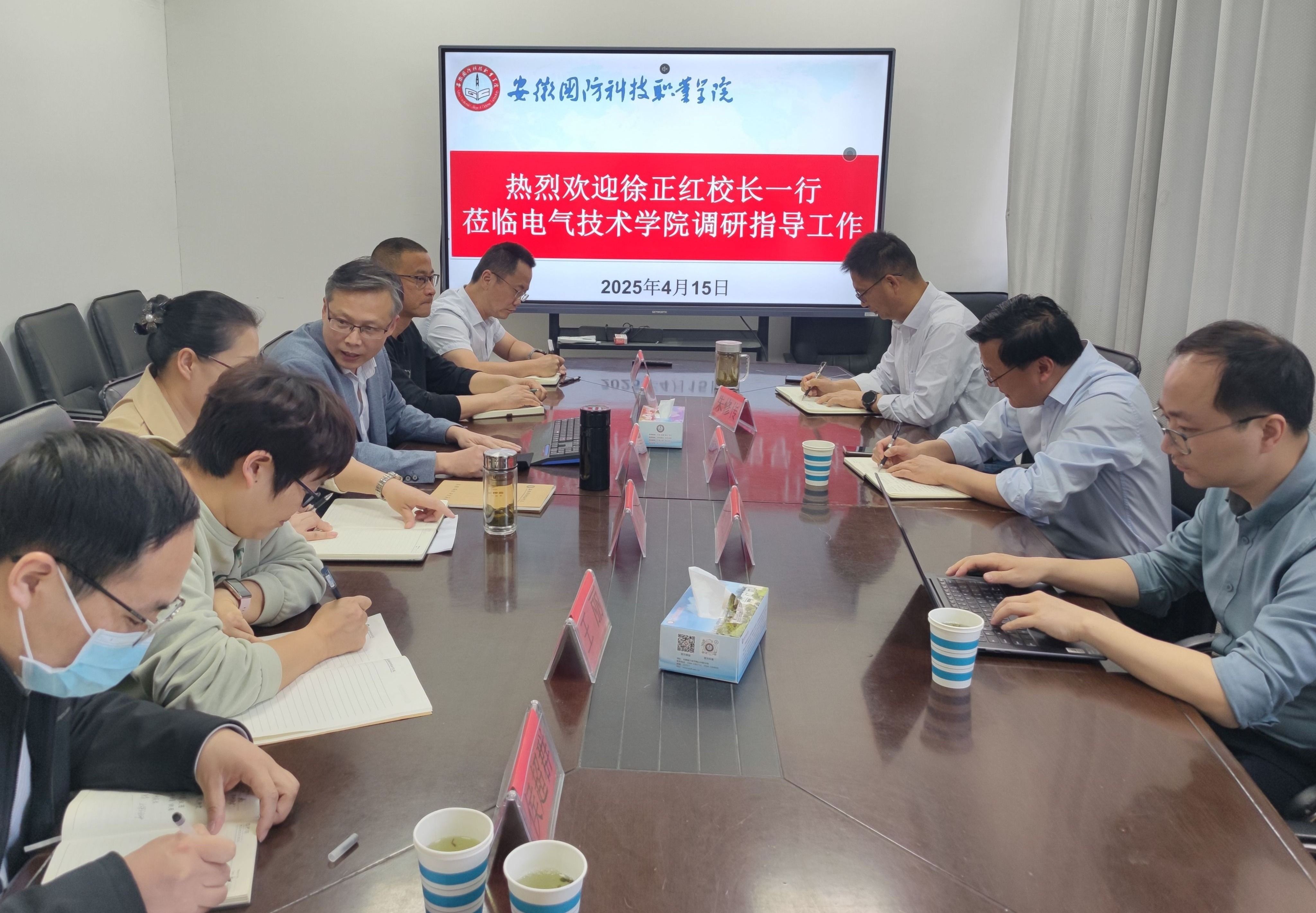 本网讯(电气技术学院 卢明瑞)4月15日下午,校党委副书记、校长徐正红,教务处处长朱修传,双高建设办公室主任韩玉龙一行莅临电气技术学院,围绕学院“十四五”规划完成情况以及“十五五”规划谋划等方面进行调研。电气技术学院党政班子成员、各教研室主任以及教师代表共同参与了此次座谈会。