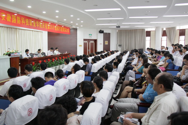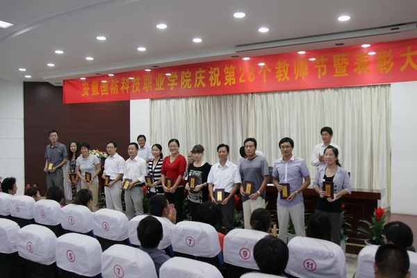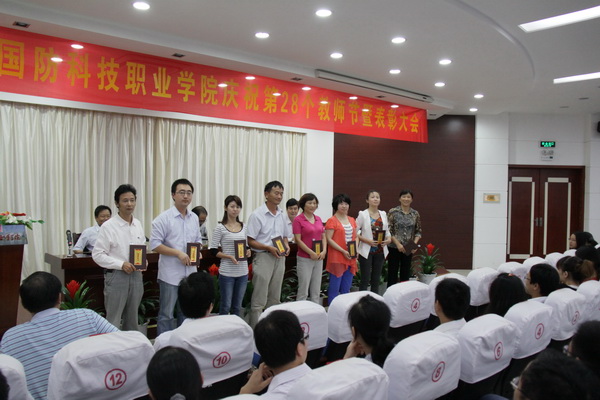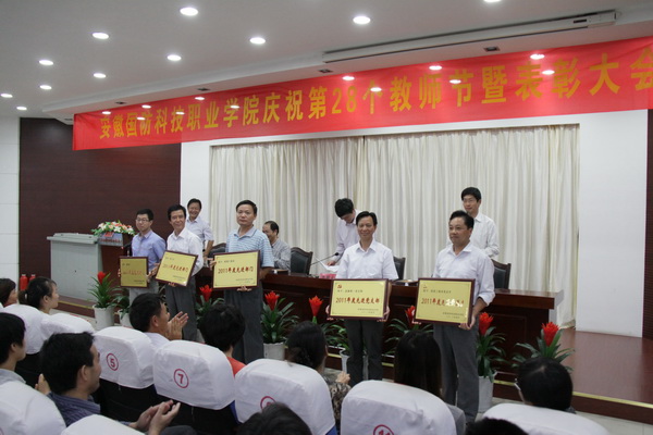 院纪委书记朱德明宣读了学院表彰决定;院长助理丁守宝宣读了中共安徽省国防科工办党组给我院全体教职员工发来的慰问信;学院领导共同为受表彰的先进集体、优秀职工、在职业大赛中指导学生获奖的指导老师等颁发了奖牌和证书。邹华东老师和丁辉老师分别作为教师代表和辅导员代表发表了获奖感言。