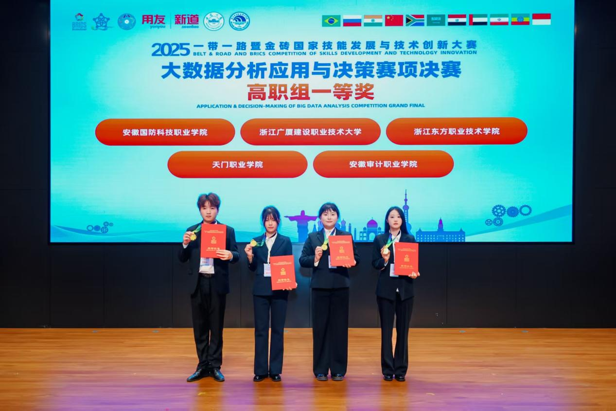 本网讯(经贸管理学院 陈龙)近日,2025“一带一路”暨金砖国家技能发展与技术创新大赛大数据分析应用与决策赛项全国总决赛在浙江东方职业技术学院圆满落幕。由beat365经贸管理学院教师陈龙、张兰指导的学生唐红燕、张文君、蒋家洲、陈行组成的参赛团队,凭借扎实的专业功底、出色的团队协作和稳定的临场发挥,在复杂的实战考题中沉着应对,最终从全国105支精英队伍中脱颖而出,以优异成绩斩获该赛项全国总决赛一等奖。