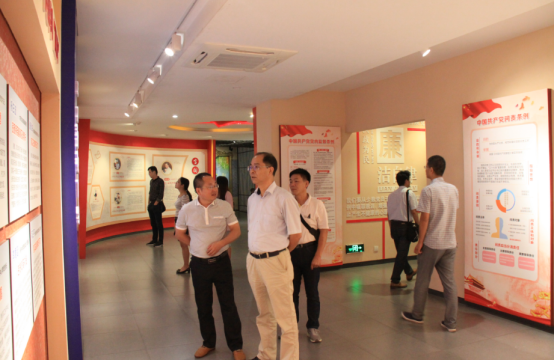 校党委书记余嗣元在廉政教育展示墙前驻足观看廉政警示案例