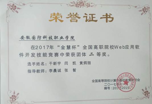 本次大赛由全国高等院校计算机基础教育研究会主办,全国高等院校计算机基础教育研究会高职计算机与电子商务专委会、江苏海事职业技术学院承办,同期举办的有“京胜杯”全国高职院校物联网应用创新设计、“环鸣杯”全国高职院校商务数据分析、“中锐杯”全国高职院校 SDN软件定义网络、“金慧杯”全国高职院校 Web 应用软件开发等4个赛项,来自全国102所高职院校共106支参赛队伍的318名选手参加了比赛参与角逐,安徽国防科技职业技术学院3名同学在比赛中展现了熟练的Web应用开发专项技能,取得“金慧杯”全国高职院校 Web 应用软件开发团体二等奖的好成绩。