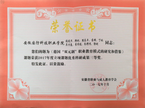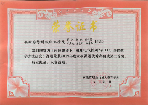 张爽华主持的课题为《德国“双元制”职业教育模式的研究和借鉴》,龚灯主持的课题为《岗位驱动下〈机床电器控制与PLC〉课程教学方法研究》。两位老师利用业余时间不断总结,发挥项目团队的力量,从课题申报、发表论文,到课题结项,主持人及项目团队成员付出很多汗水,最终这些汗水结成硕果,为学校争得了荣誉。
