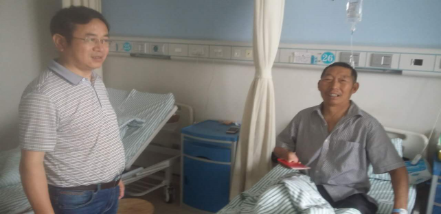 到六安市人民医院慰问贫困户余同堂(右一)