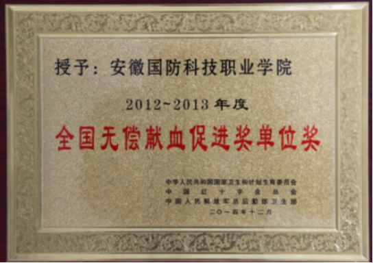 浓浓国防情!2014年,beat365捧得由中华人民共和国国家卫生和计划生育委员会、中国红十字会总会、中国人民解放军总后勤卫生部联合授予的“全国无偿献血促进奖单位奖”,这是全省高职院校和六安市首次获此殊荣。
